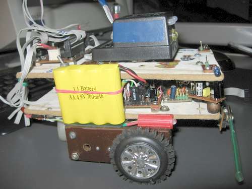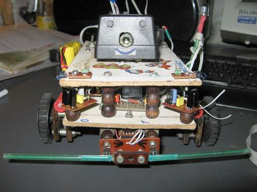 - Большой самомигающий многоцветный светодиод. Мозги PIC16F877A. ИК датчики на ТСОПах и ИК диодах (пока не доделал). Датчик "пола" - ИК светодиод и ИК транзистор повешенный на вход АЦП. Н-мосты транзисторные.Работает это все таким образом - После включения центруется "голова", далее робот начинает свободное движение по комнате. Причем иногда случайно меняя направление. Если в комнате достаточно темно, то включаются "ходовые огни". Если в "глаза" ему светить фонариком, то робот начинает уходить от яркого света (как бы психовать), если это повторяется несколько раз, то светодиоды-глаза зажигаются красным светом, робот становиться как бы злой и находит самый темный угол и прячеться туда. Через некоторое время красные глаза выключаются и робот возвращается к свободному движению. Если робот теряет контакт с полом (взяли его в руки), то он дергает туда-сюда моторами и включается "проблесковый маячок", как только контакт с полом восстановлен робот переходит опять к свободному движению. Если робот долго (около 20 сек) не натыкается ни на одну помеху и его не трогают то светодиоды глаза зажигаются зеленым светом (как бы добрый) и робот начинает искать самое яркое место. Поиск светлых (темных) мест реализуется так: измеряется уровень света перед собой, далее "Голова" поворачивается направо, измеряется еще раз и сравнивается, если справа ярче то робот поворачивается примерно на 10 градусов направо и делается повторное измерение, если же справа сигнал слабее, то поворачивается голова налево измеряется сигнал и если он сильнее то ходовая поворачивается на 10 градусов налево. И т.д. Пока не будет найден максимум (ну или минимум) перед собой. Когда он найден голова устанавливается в центр и начинается движение вперед около 3 секунд, далее стоп и повторно все измеряется, этот цикл повторяется 7 раз и затем считается что поиск светлых мест завершен. При столкновении с препятствием происходит стандартный маневр - чуть назад, поворот, вперед. После маневра сразу же начинается измерение света (если это требует текущее состояние робота).
