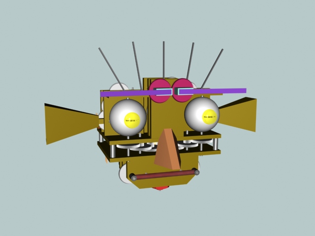 Схема трехколесная, с одним задним опорным и двумя ведущими колесами, редукторы самодельные. "Голова" поворачивается на самодельном сервоприводе, в качестве датчиков положения головы используются обычные штырьки, которых касается пружинка при повороте. Т.е. 3 положения - ЦЕНТР, ВЛЕВО 45 градусов и ВПРАВО 45 градусов. На "голове" установлен датчик видимого света, и 2 двухцветных светодиода. Также на роботе установлены "ходовые огни", впереди 2 синих и 2 красных сзади, а также "проблесковый маячок"