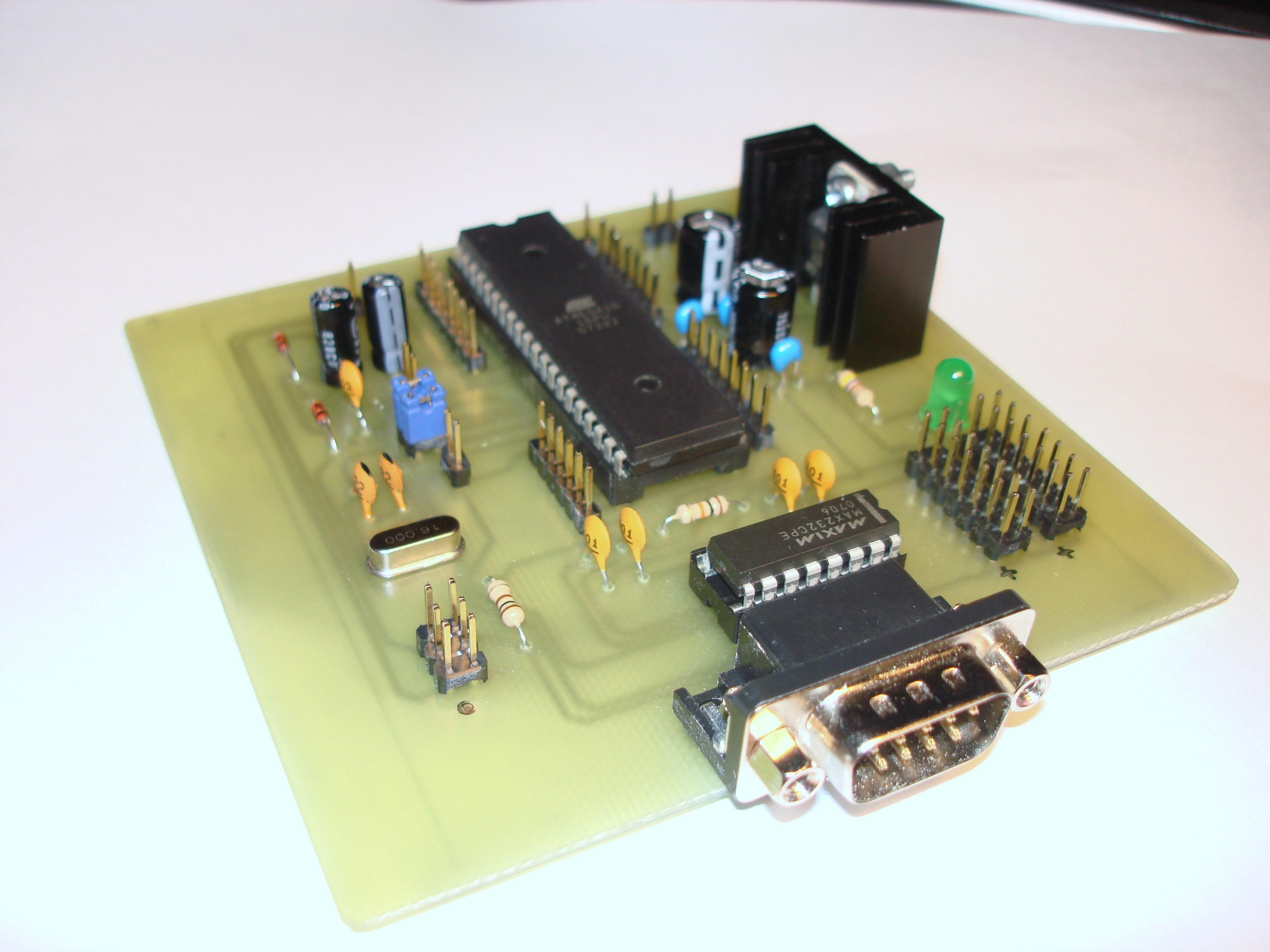 Не стал туда добавлять ничего лишнего, кроме возможности подключения к COM-порту и простенького генератора отрицательного напряжения. В остальном это обычная плата с ATmega16, кварцем, стабилизатором напряжения и расширенными дополнительными разъёмами для питания остальных устройств.