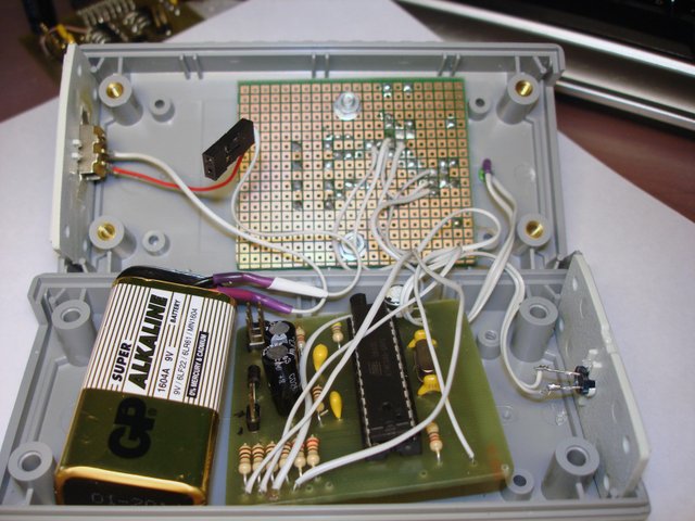 Не стал туда добавлять ничего лишнего, кроме возможности подключения к COM-порту и простенького генератора отрицательного напряжения. В остальном это обычная плата с ATmega16, кварцем, стабилизатором напряжения и расширенными дополнительными разъёмами для питания остальных устройств.