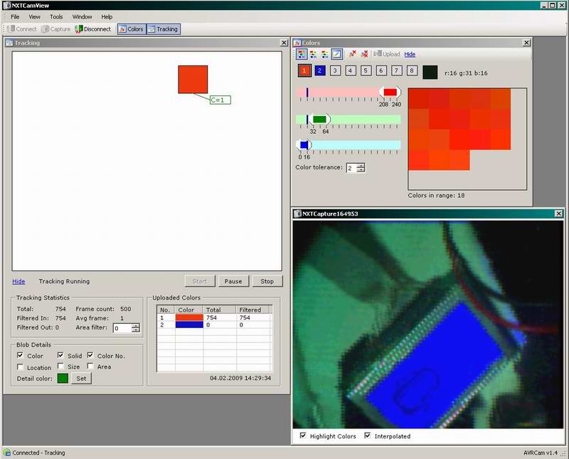 После прошивки мега мигала отладочным светодиодом, отправляла команды на матрицу по I2C и всё. больше никаких признаков жизни. Никакой реакции на команды UARTа. Пришлось адаптировать его программу под свой компилятор, переписывать. Но и после адаптации стало не намного лучше. Мега стала отвечать на команды, но при попытке дать команду "взять кадр" или "включить слежение" наглухо висла. Было решено проверять программу по частям. Сначала я написал отдельную программу для снятия кадров. Она, естесственно, потребовала программу для компа, которая отображала бы принятый кадр. Этот софт (со стороны компа) написан на яве, и лежит на официальном сайте в виде исходников. Честно говоря я не знаю что мне делать с этими исходниками. Поэтому я написал небольшую утилитку, принимающую данные по УАРТу, и складывающую их в картинку. Следующим шагом было исправление программы для меги. Она стала снимать кадры, но при попытке включить слежение всё так же висла. После нескольких дней мучений наконец она стала выдавать на команду ""включить слежение" в терминал данные. Писать программу на комп, отображающую принимаемые пакеты в удобоваримом виде было выше моих сил, так как под комп программист из меня хреновый. Поиск в гугле навёл меня на интересную вещицу - NXTCam. По сути это клон AVRCam, причём клон до мелочей, включая протокол передачи. Делает его некая контора, производящая модули для конструктора лего майндсторм. Клиентская программа для камеры шла в виде инсталлятора. Я установил её на комп, и она признала мою камеру.Myp писал(а):вот бы ещё найти место где такие камеры можно купить...