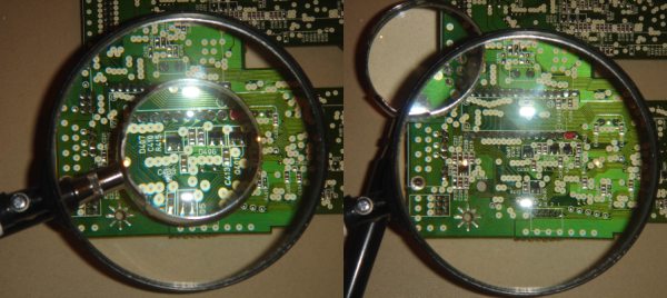 Удобно паять на макетке SMD компоненты (резисторы и конденсаторы). Значительно удобнее, чем обычные компоненты, для которых нужно еще найти место. С помощью 3-х кратной линзы, тонкого (1мм) "нитки" припоя (купил очень дешево 4 катушки в Ашане), пинцета и 18 ваттного паяльника с 1мм жалом. Позже сделал двойную оптику - за 10см 2-кратной линзой (50 руб в канцтоварах), установил подвижную 50мм 3-кратную линзу (еще 20 рублей). По мере необходимости использую большую линзу - большой угол обзора, или придвигаю в дополнение к ней маленькую. Линзы закреплены на куске металлопластиковой водопроводной трубы, прикрученной болтом к дешевой струбцине.