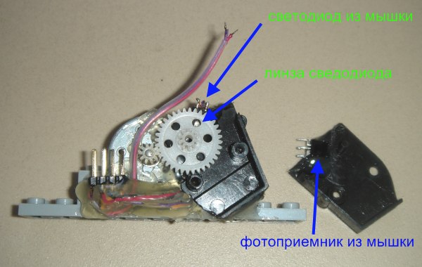 Собрал быстренько лайнтрейсера из Лего и мотор-редукторов от LegoMinibot'a, но поскольку аккумуляторы не подключал еще (использую 4 батарейки), ездит о-о-чень медленно, но датчик успешно работает.