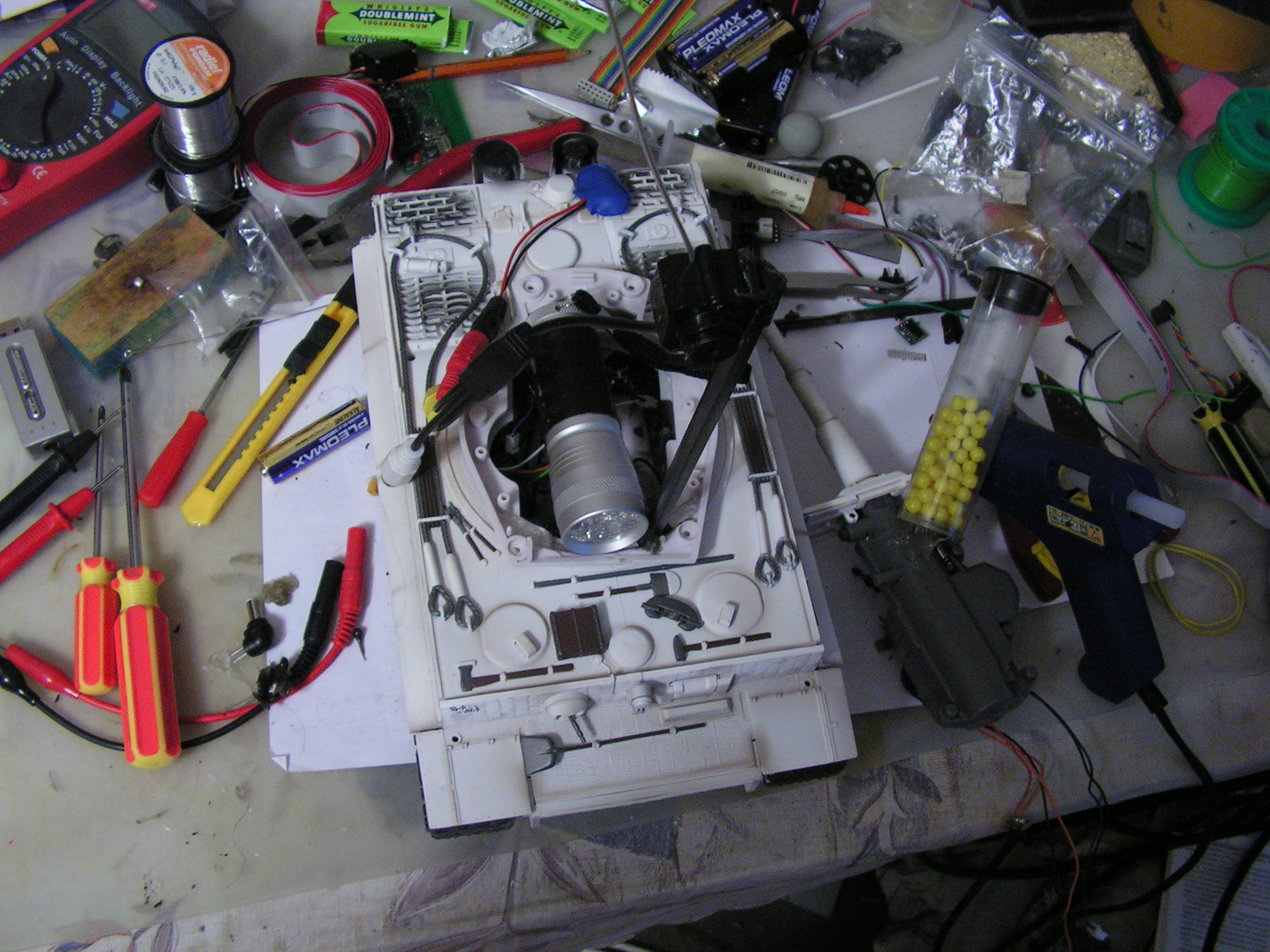 В нем была имитация работы мотора, громкая цука! А башня будет не родная, не вписался по внутреннему обьему. Но пушка будет точно, тем более что на неё нужен один ключ и все... Только не знаю как с бункером для шариков быть, ближе к реализации видимо.