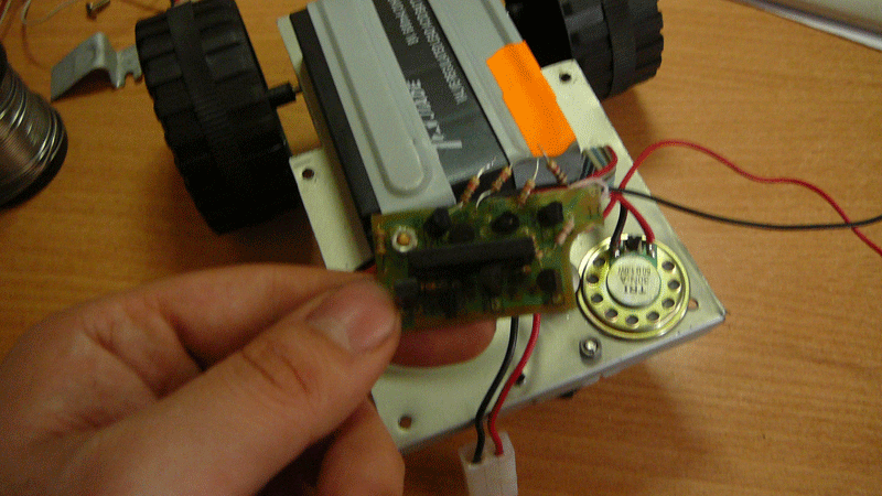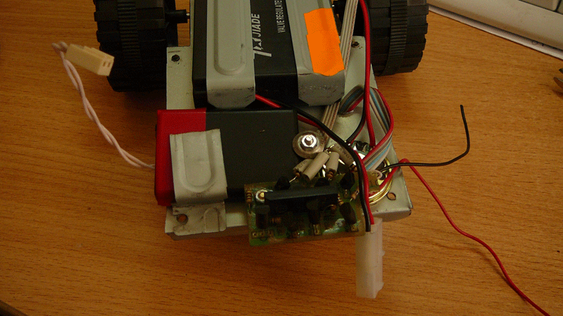 Ну наконец смог что-то собрать свое. К критике нормально отношусь, знаю что недочетов много - но это мой первый робот, потому кое что можно допустить. Я его планирую дорабатывать и результаты выкладывать в этой ветке. В общем электроника на основе полной комплектации электроники минибота. Шасси самодельное: основа - железо компьютерного блока питания, редуктор от игрушечного танка (довольно мощные двигатели потребление=1-1,5 А),драйвер двигателей тоже от него. Аккумуляторов 2, 1й 8 В 750 мА, 2й 4,2В, от сотового телефона. Подруливающее колесо от мебельного колеса. Робот управляется пока от ИК пульта, жду ИК-дальномеры, когда будут, тогда сделаю чтоб автономно двигался. Пока поставил на движки выключатель от компьютерного блока питания, потом чем нибудь заменю покомпактнее. Ниже выкладываю фотографии. Это незаконченый вариант, планирую дорабатывать