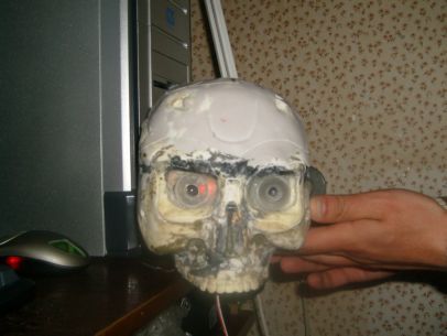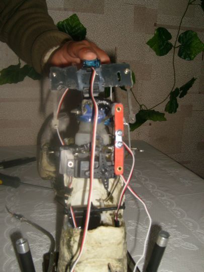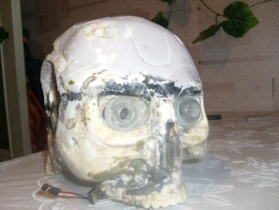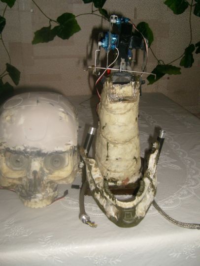 Делаю уже несколько лет по причине переделывания или усовершенствования. Изначально на конструкции стояли электродвигатели от всевозможных игрушек с самодельными редукторами, но движения не соответствовали желаемому, и по этому заменил на серво, всего семь штук. В правом глазу вэб камера.