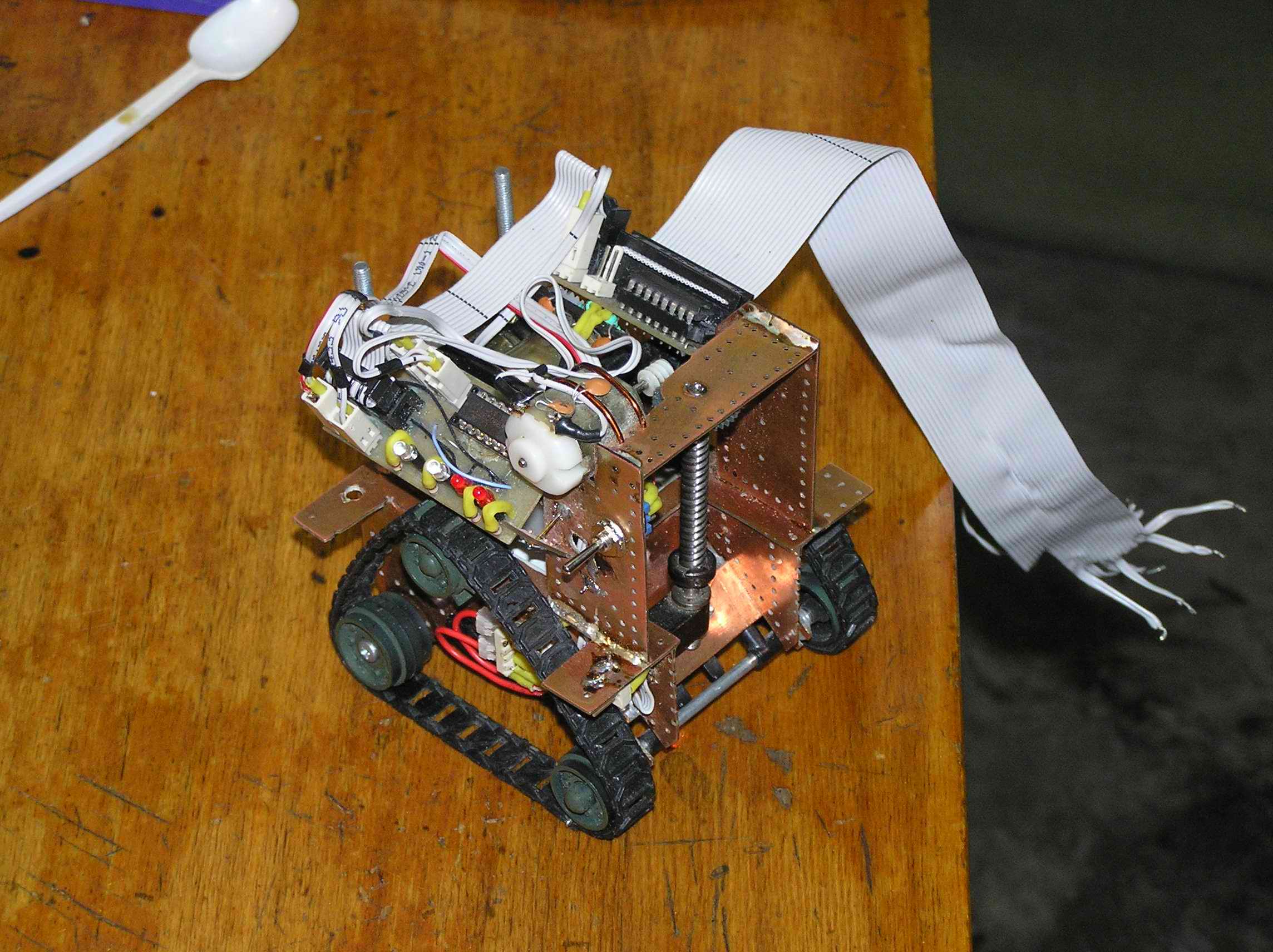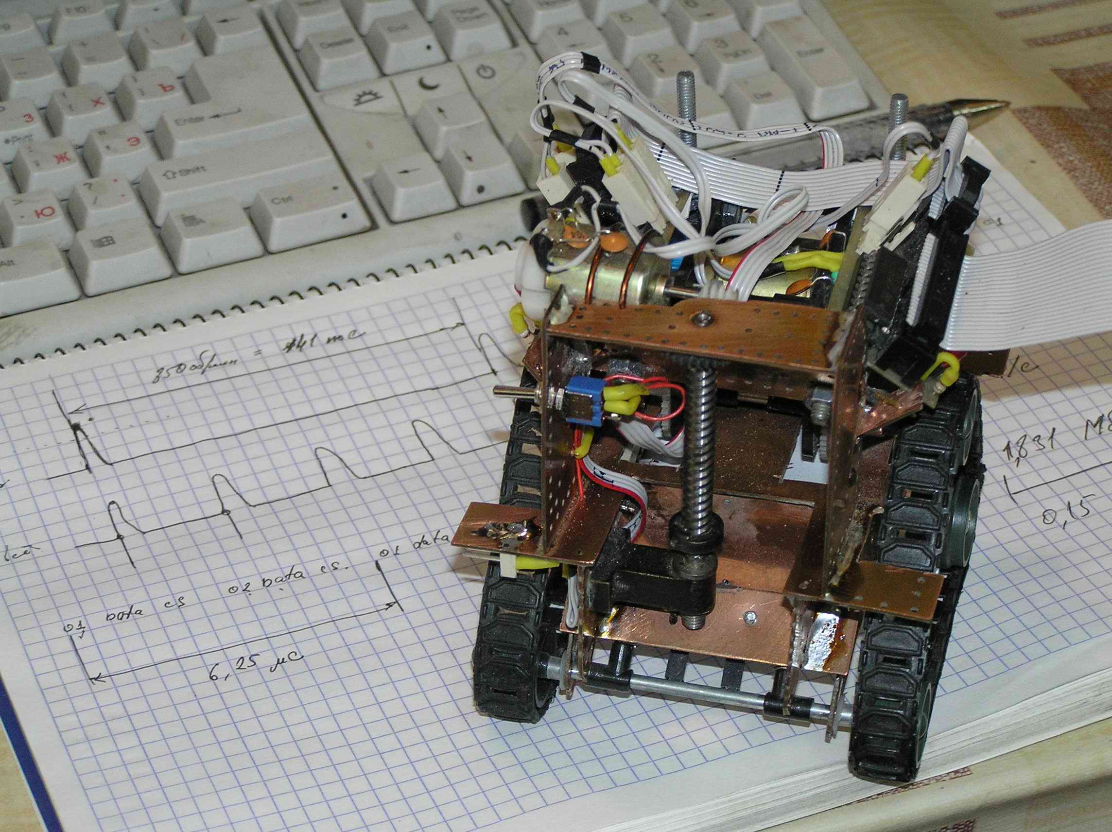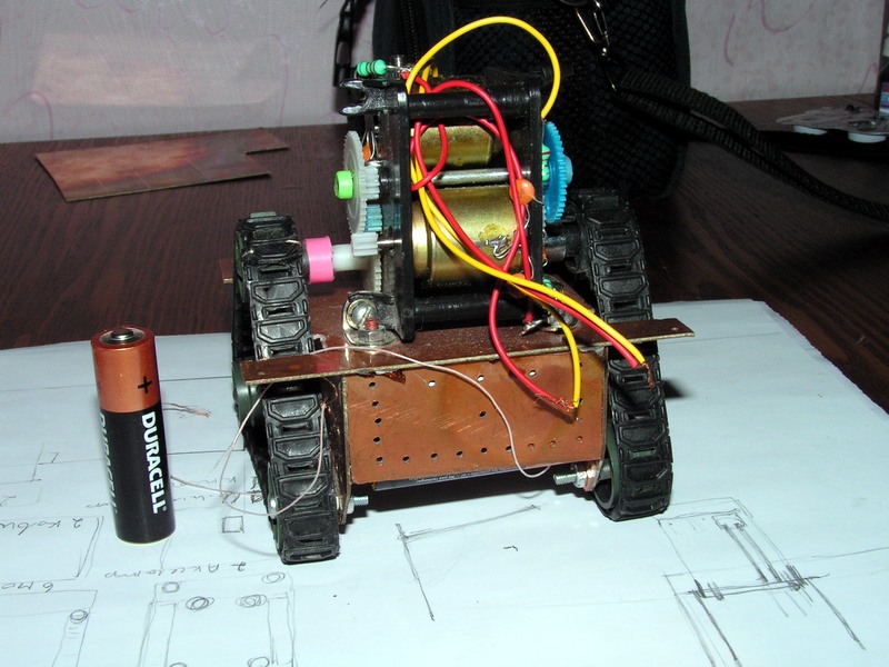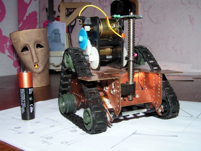 Пара моторов, гусеницы, редуктор на столе. Сижу за бумагой и рисую платформу. Вырезал платформу - корпус и фольгинированного текстолита, спаял, запустил - на мою детскую радость - поехало. Приладил червячную механизму от военного прибора для опракидывающего ковша. мда, сурово, запустил, запустил - что то нето, чтото заело, чтото открутилось...силы такие что ковш просто вырвало вместе механизмомом... переделываю...