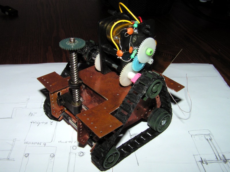 Пара моторов, гусеницы, редуктор на столе. Сижу за бумагой и рисую платформу. Вырезал платформу - корпус и фольгинированного текстолита, спаял, запустил - на мою детскую радость - поехало. Приладил червячную механизму от военного прибора для опракидывающего ковша. мда, сурово, запустил, запустил - что то нето, чтото заело, чтото открутилось...силы такие что ковш просто вырвало вместе механизмомом... переделываю...