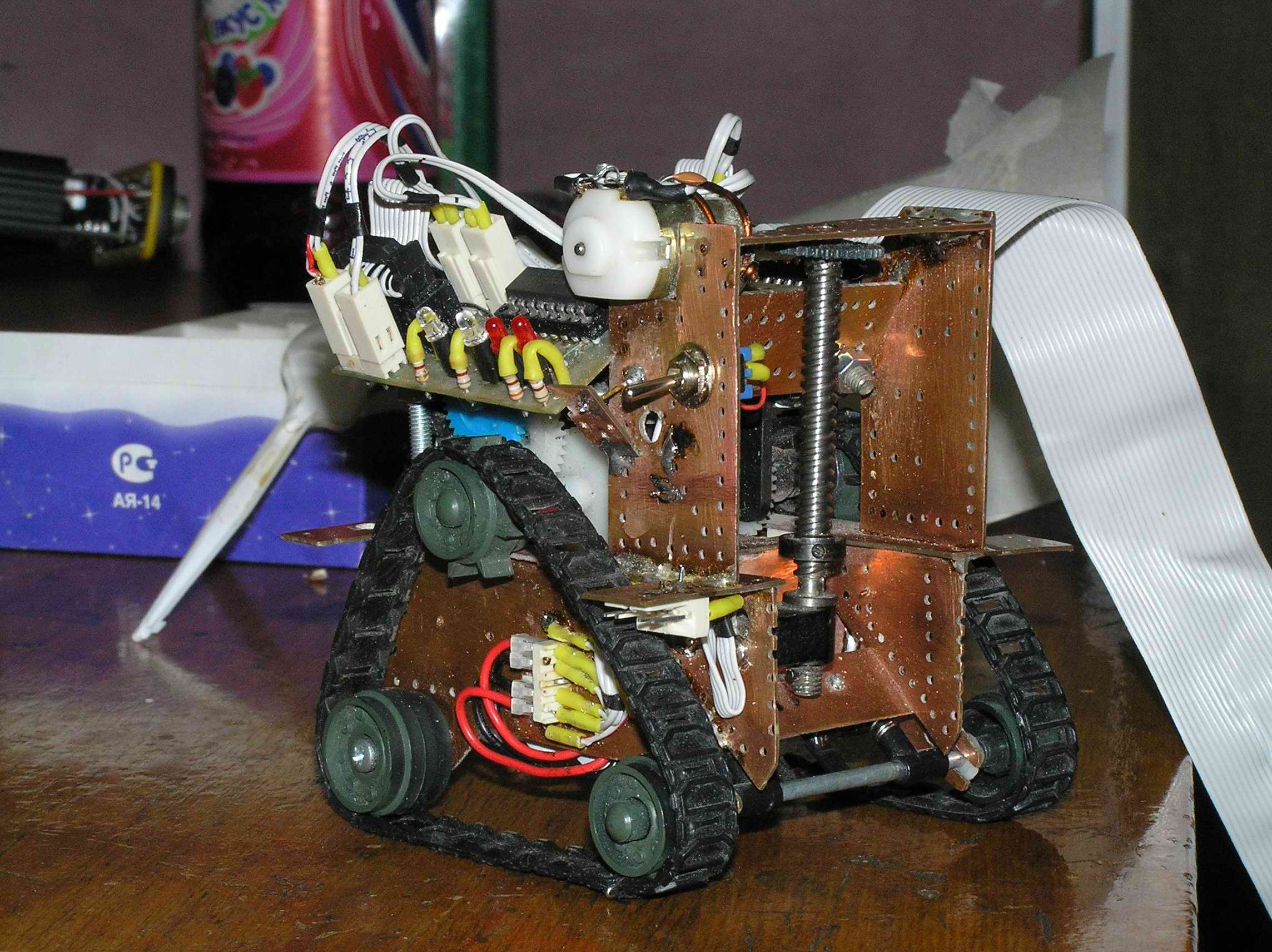 Пара моторов, гусеницы, редуктор на столе. Сижу за бумагой и рисую платформу. Вырезал платформу - корпус и фольгинированного текстолита, спаял, запустил - на мою детскую радость - поехало. Приладил червячную механизму от военного прибора для опракидывающего ковша. мда, сурово, запустил, запустил - что то нето, чтото заело, чтото открутилось...силы такие что ковш просто вырвало вместе механизмомом... переделываю...