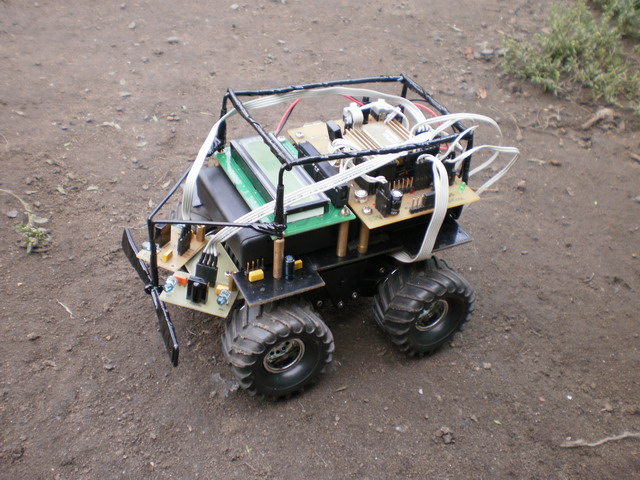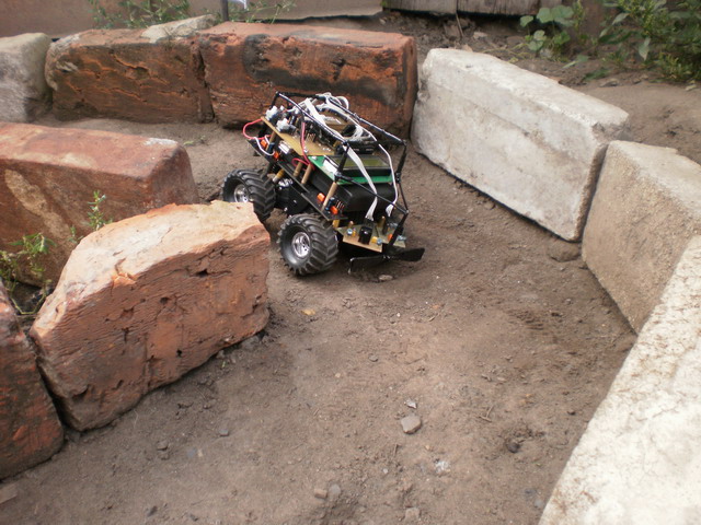Все тот же RBT-2008,правда немного модифицирован, добавлен каркас который защищает электронику в случае если робот перевернется (бывает очень часто на спуске при попадании в яму. И изменено расположение ик-датчиков расположенных спереди.