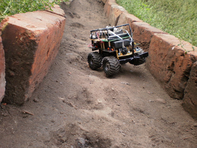 и не только на спуске, такие ямы делались специально для зрелищности прохождения трассы и расположены по всей трассы, за исключением подъема. На подъеме имеется пара ям (но уже естественных) и из за малого веса робота и то что покрытие трассы – грунт, при движении на подъем при попадании в яму может иногда по буксовать, большую часть выезжает сам но бывало что и приходилось подтолкнуть. Мощности и крутящего момента хватает вполне.