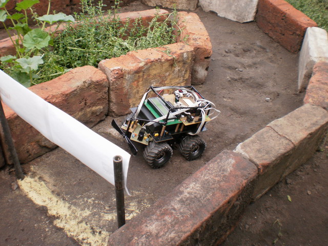 Все тот же RBT-2008,правда немного модифицирован, добавлен каркас который защищает электронику в случае если робот перевернется (бывает очень часто на спуске при попадании в яму. И изменено расположение ик-датчиков расположенных спереди.