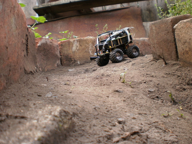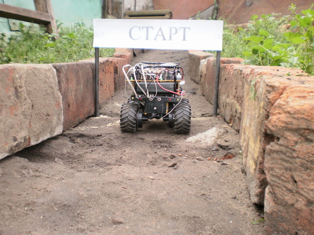 и не только на спуске, такие ямы делались специально для зрелищности прохождения трассы и расположены по всей трассы, за исключением подъема. На подъеме имеется пара ям (но уже естественных) и из за малого веса робота и то что покрытие трассы – грунт, при движении на подъем при попадании в яму может иногда по буксовать, большую часть выезжает сам но бывало что и приходилось подтолкнуть. Мощности и крутящего момента хватает вполне.