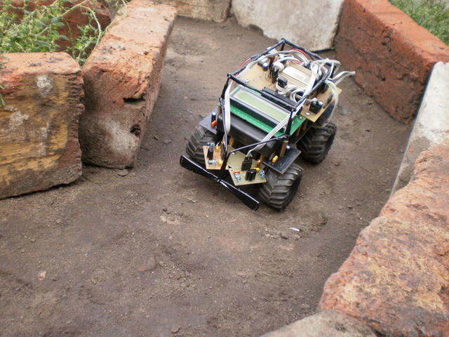 Все тот же RBT-2008,правда немного модифицирован, добавлен каркас который защищает электронику в случае если робот перевернется (бывает очень часто на спуске при попадании в яму. И изменено расположение ик-датчиков расположенных спереди.