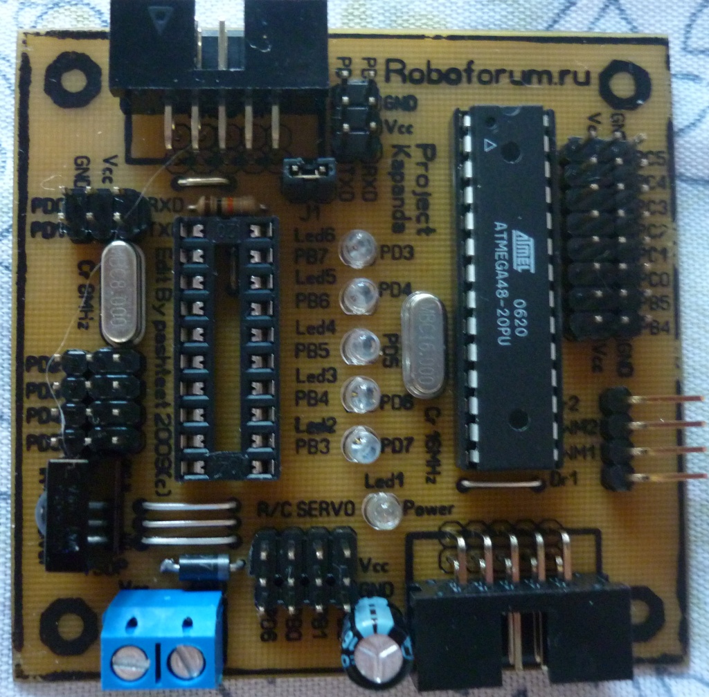 Контроллер расчитан на взаимодействие двух МК (мега48 и тинька2313) между собой по 4-м портам. Мега будет ведущей, отвечать за ШИМ двигателей, Rc5, работу АЦП дальномера, при этом по прерыванию на INT1 (PD3) будет обращать внимание на Тиньку, которая в свою очередь будет вертеть сервой и обрабатывать датчики поверхности (тоже по прерываниям). Тинька будет все время следить за результатами АЦП и если есть препядствие, то останавливать серву, как препядствие исчезло - востанавливать вращение с того же положения
