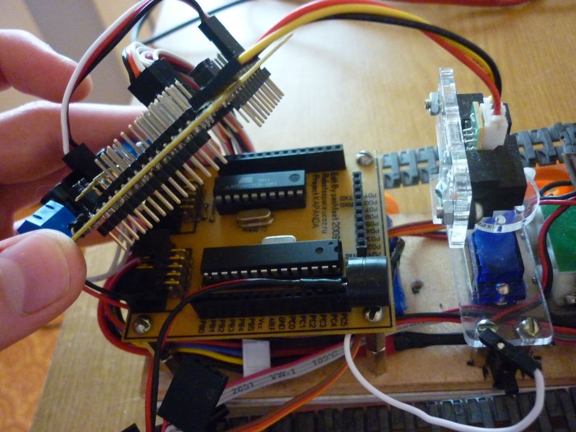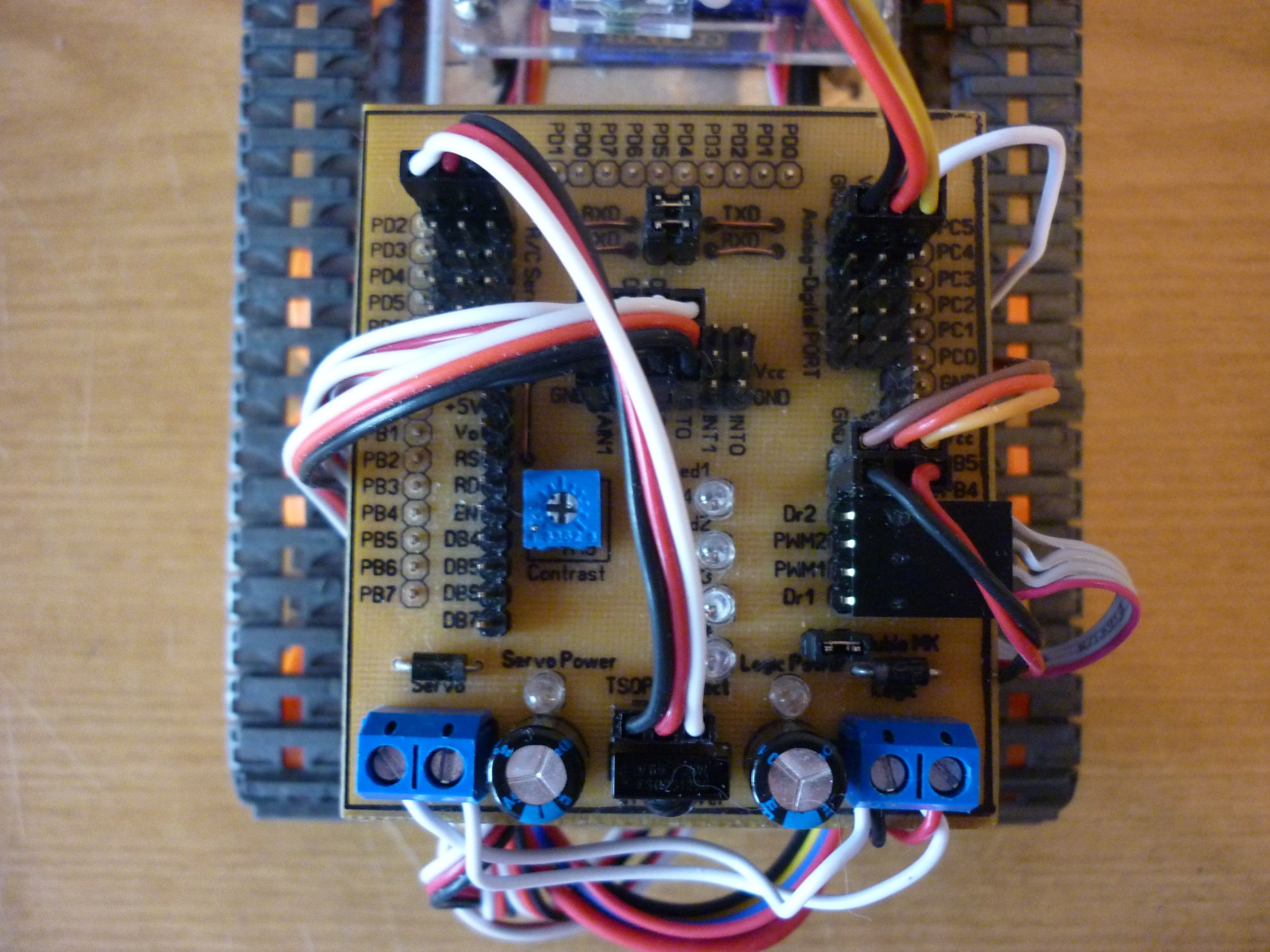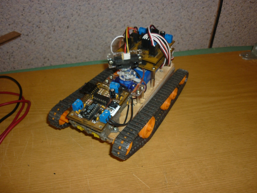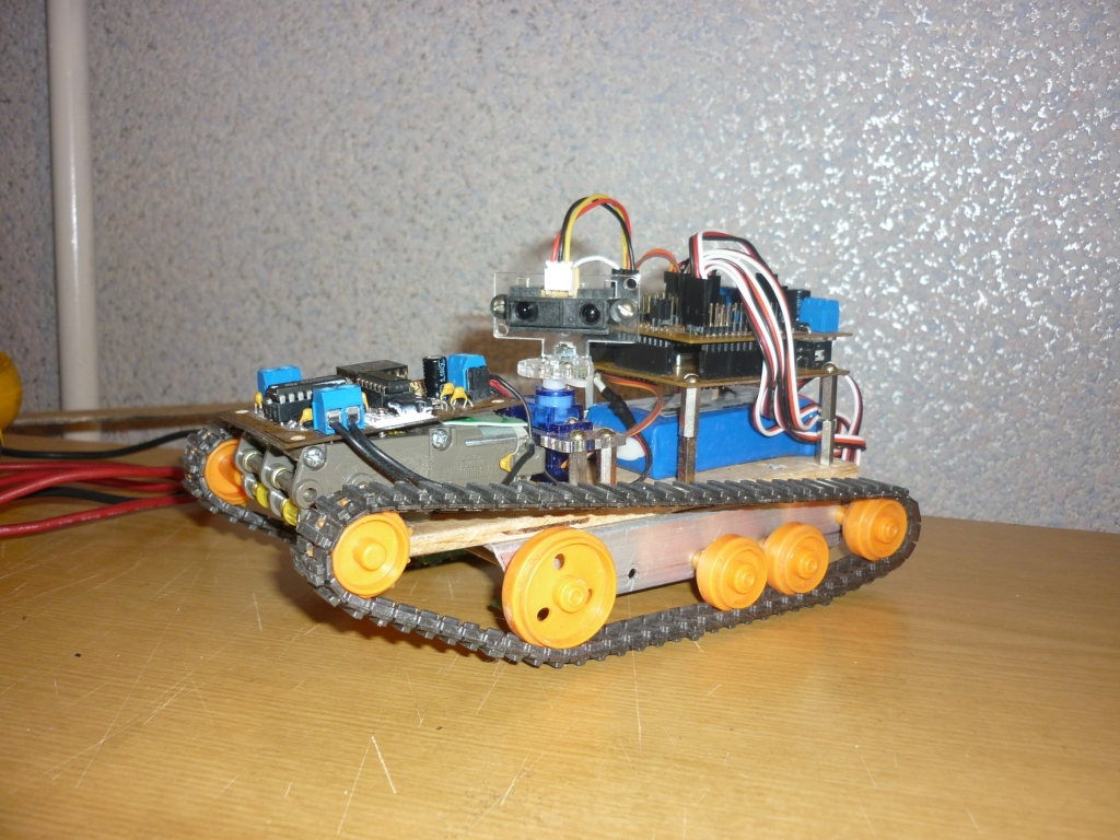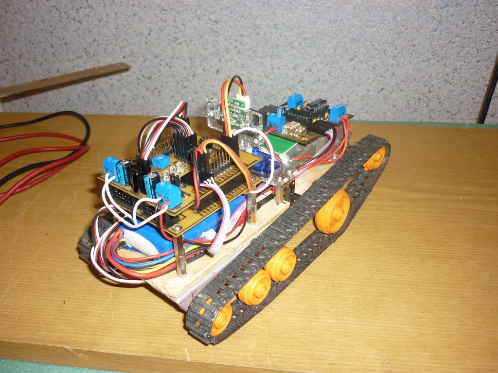 Посравнению с предыдущей версией проходимость даже улудшилась, и гусиницы перестали слетать на ковре, т.к. немного уменьшилось пятно контакта (задние ролики стали немного выше, т.к. меньшего диаметра)