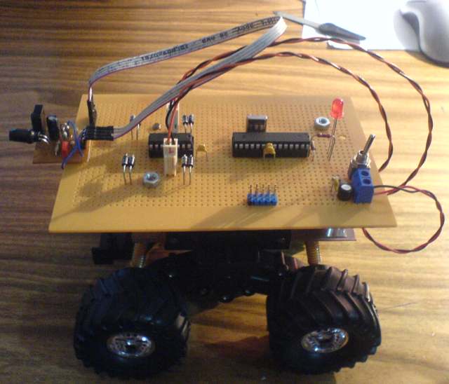 Питание - 4 аккума по 1,2V 2500mAh реально выдают 5,2V при полном заряде, двигатели питаются от аккумов напрямую, логика - через конденсаторы, особых помех вроде не наблюдается. В качестве драйвера L293B, движки тупо китай, при зажатом валу кушают по 0,8А.
