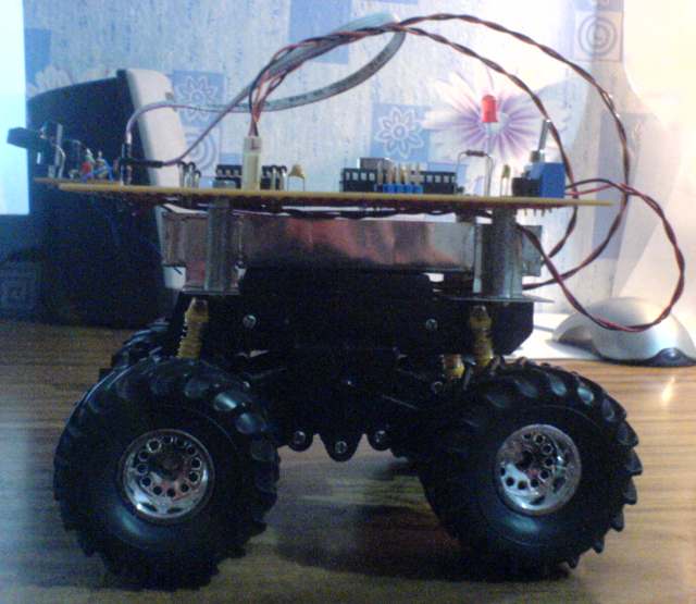 Питание - 4 аккума по 1,2V 2500mAh реально выдают 5,2V при полном заряде, двигатели питаются от аккумов напрямую, логика - через конденсаторы, особых помех вроде не наблюдается. В качестве драйвера L293B, движки тупо китай, при зажатом валу кушают по 0,8А.
