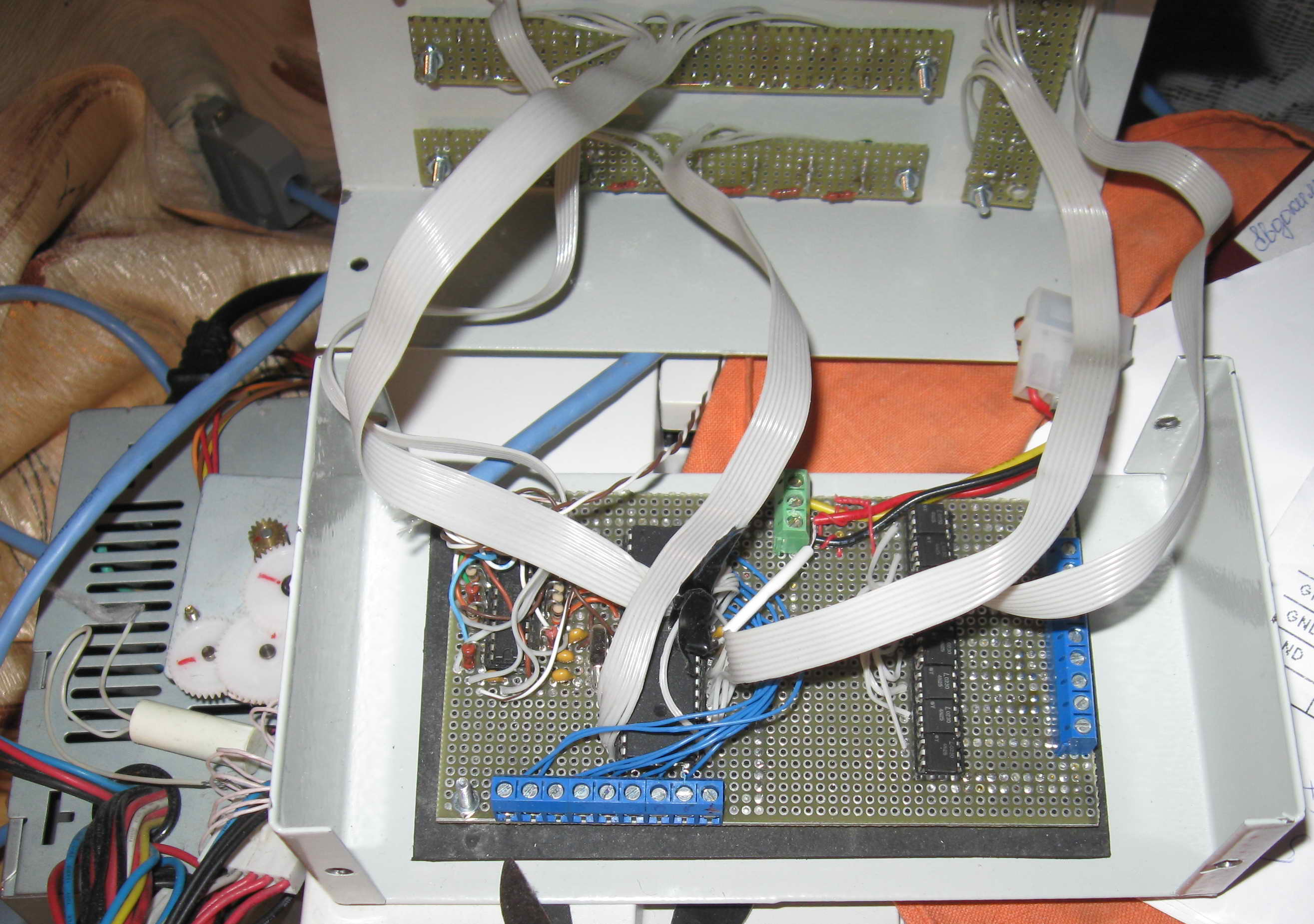 Сделал маленький стендик для изучения МК на мега16. К порту А подключены микрокнопочки и параллельно с ними клеммные калодки, чтобы можно было датчик какой-нибудь подключить. Порт D управляет горизонтальным рядом светодиодов, порт C кроме вертикального ряда светодиодов управляет выходами оптронов 4N25 для возможности подключения микродвигателей или маломощного оборудования. Для удобства оптроны также выведены на клеммные калодки (вертикалый ряд).