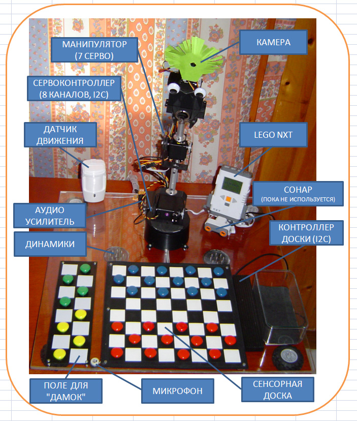 Вспоминая РОБОТА ШАХМАТИСТА решил продолжить тему настольных игр. Новый робот для разнообразия играет в шашки. Мозгом по прежнему является внешний ПК, в остальном, ничего общего с «шахматистом». Основной задачей было сделать робота более «живым». Если, придание эмоций кран-балке было бы затруднительно, то с манипулятором это вполне возможно. Робот проявляет характер в процессе игры. Бывает раздражен, весел, печален и т.д. Болтает на трех языках. Робот имеет потенциал для развития. Планирую научить его играть в другие игры, использовать технологии распознавания речи и распознавания лиц. В общем, главное в нашем деле – алгоритмы. Ими и займемся.