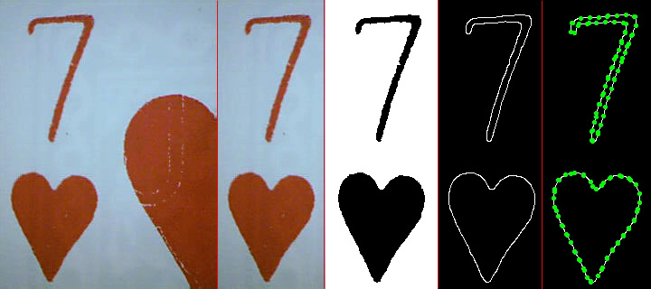 Т.е. вырезает нужную область, преобразует в ч/б, очерчивает контуры символов и апроксимирует их отрезками. В результате получается массив координат точек излома линий. Далее, RoboRealm просто передает программе, управляющей игрой, длину этого массива. Незначительные смещения и повороты карты в рамках контейнера, практически не влияют на апроксимацию контуров. Получается для каждой карты уникальная длина массива с небольшой погрешностью. Для упрощения можно сразу определить цвет карты и разделить их на красные и черные, чтобы для каждого вида выбрать свой порог для преобразования в ч/б.