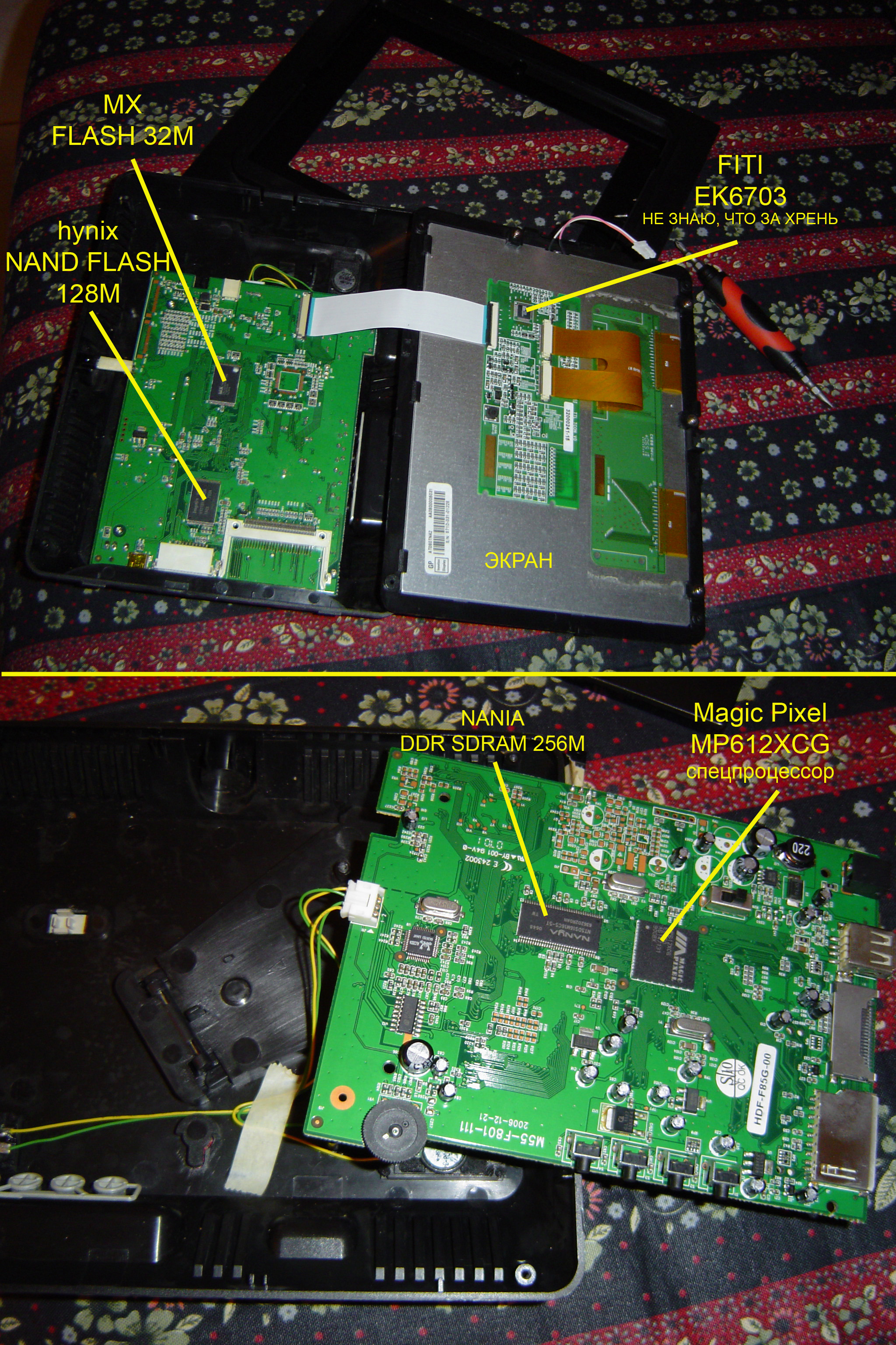 Чтоб представлять, с чем имеем дело. Сборная солянка тайваньских чипов. А на процессор даташита нет даже на сайте производителя. Экранчик LCD 8", память под фотки 256М + картридер на все популярные типы карточек. Но, увы, зацепиться, чтобы сделать "чистый хак", не за что.
