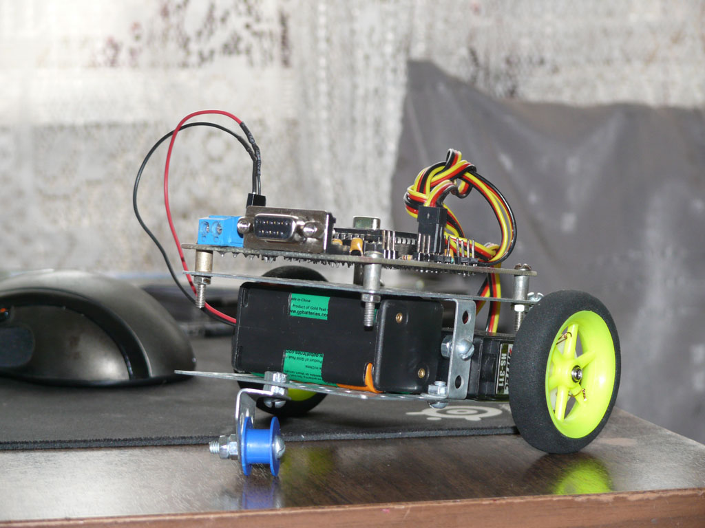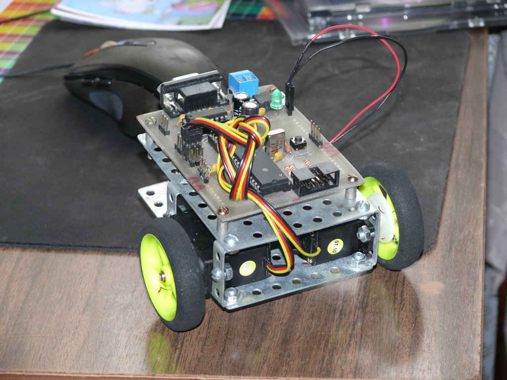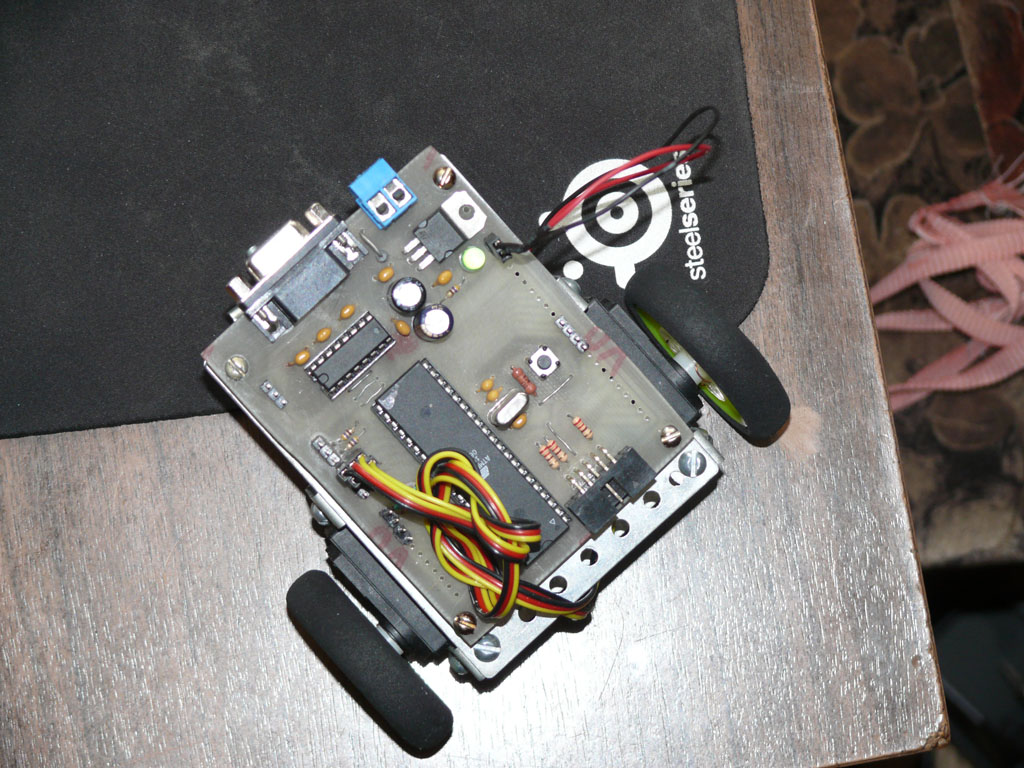 Она собрана из старого отечественного металлического конструктора, два сервопривода от самолета, колеса от того же самолета, и плата mrc-40 с http:\\robozone.su