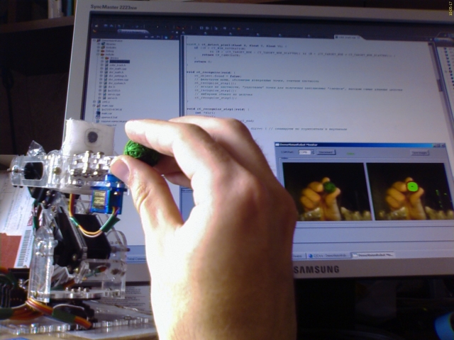 Робот на основе манипулятора OR-LC-xARM-v1 со схватом OR-LC-GRIP-HXT900-v1. Система управления на базе отладочной платы Olimex LPC-H2103 c МК NXP LPC2103. На схвате установлен модуль TGA130V10 с видеокамерой. Робот обнаруживает в поле своего зрения зеленый шарик, следит за ним, пытается схватить, и когда ему это удается, складывает в корзину. Функционирование полностью автономное.