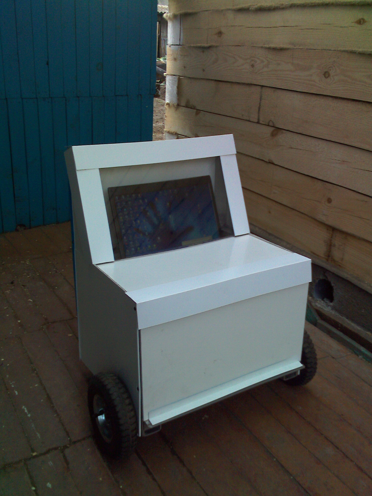 Рама - алюминий, дюраль. Корпус - пластиковые панели, уголки, оргстекло(защита монитора).