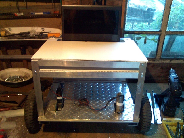 Рама - алюминий, дюраль. Корпус - пластиковые панели, уголки, оргстекло(защита монитора).