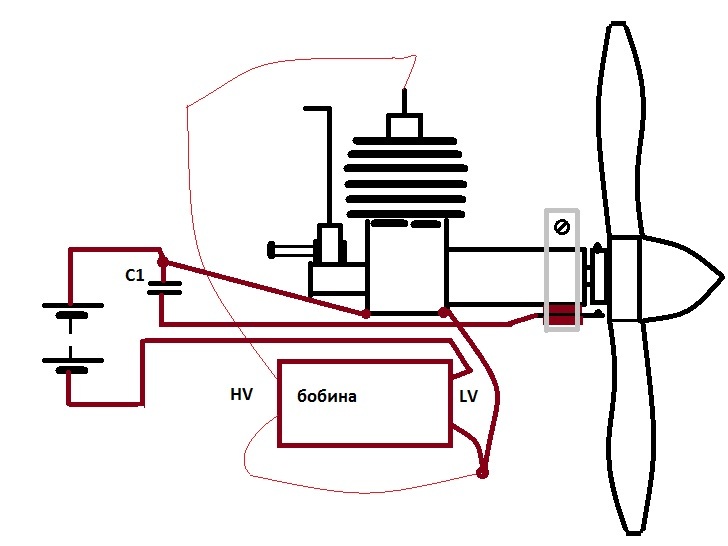 . Дык прерыватель зажигания сделал просто: гибкий контакт от реле меж двух пластин изоляторов и на хомуте к мотору. На вращающейся части добавил небольшой медный болтик с гладкой головкой - это второй контакт (он же корпус мотора). Вращая хомут добивался точных 5град. до ВМТ. Ну на рисунке вроде как понятно? Мождь и тебе устроить не геркон (который вполне может лажать), а непосредственный контактор (как в настоящих тромблерах)?