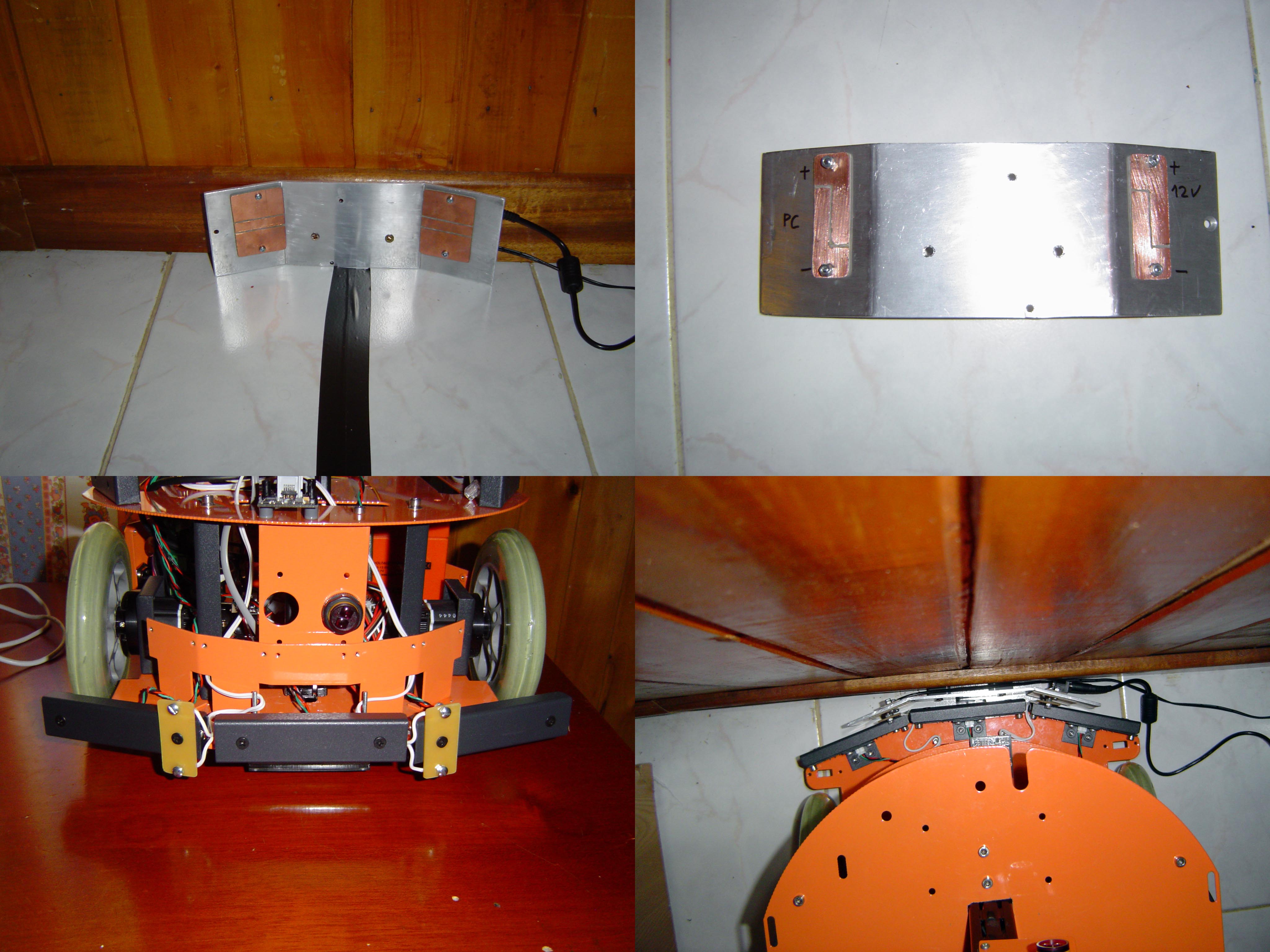 Вот, простенькую зарядную базу забацал. Устройство понятно из фотки. Прикручивается к плинтусу в укромном месте. Благодаря черной линии, робот точно паркуется на базу. А надежный контакт обеспечивает подпружиненный бампер. В будущем планирую попробовать парковаться с помощью «