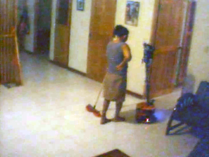 Пока Ванесса выезжала из детской (именно там она живет), женщина опасливо пятилась, не прекращая при этом машинально мести перед собой щеткой.