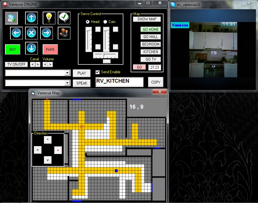 Эксперимент начался с неудачи: старательная мучача, вытирая пыль с полки, свернула в сторону установленную там вебку, подключенную к скайпу. По ней я должен был определить, когда женщина переместиться в залу, чтобы пригнать туда робота. Эксперимент пришлось продолжить без возможности записи качественного видео и ориентируясь о передвижениях «объекта» на слух. Отложить не мог, т.к. на днях уезжаю в отпуск и это был последний приход уборщицы в этом сезоне.