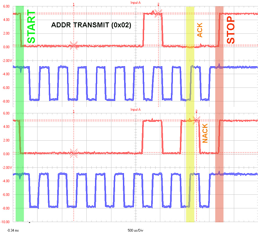 Короче, посыпаю голову пеплом и признаю свое поражение от собственноручно запаянного контроллера. Никакие программные и аппаратные ухищрения не помогли. Вот реальная осциллограмма передачи адресcа компасу (ограничился этим этапом, т.к. уже он дает сбои).