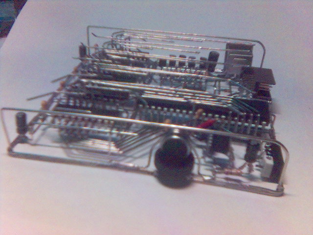 Следующим этапом было соединение блока микросхем с портом C меги. Я выложил эти 5 перемычек на чертеж и приклеил их к чертежу скотчем. А к торчащим выводам с одной стороны подпаял блок микросхем, выравнивая по чертежу, а с другой таким же образом мегу. Затем эту кострукцию вставил в раму, припаял землю меги и всех микросхем. Уже к этой сборке подгонял и паял все остальное, подкладывая соответсвующие подставки для соблюдения высоты нижнего слоя. Плюсовой проводник имел довольно длинную болтающуюся часть, и я его "привязал" к земле через три электролитических конденсатора.