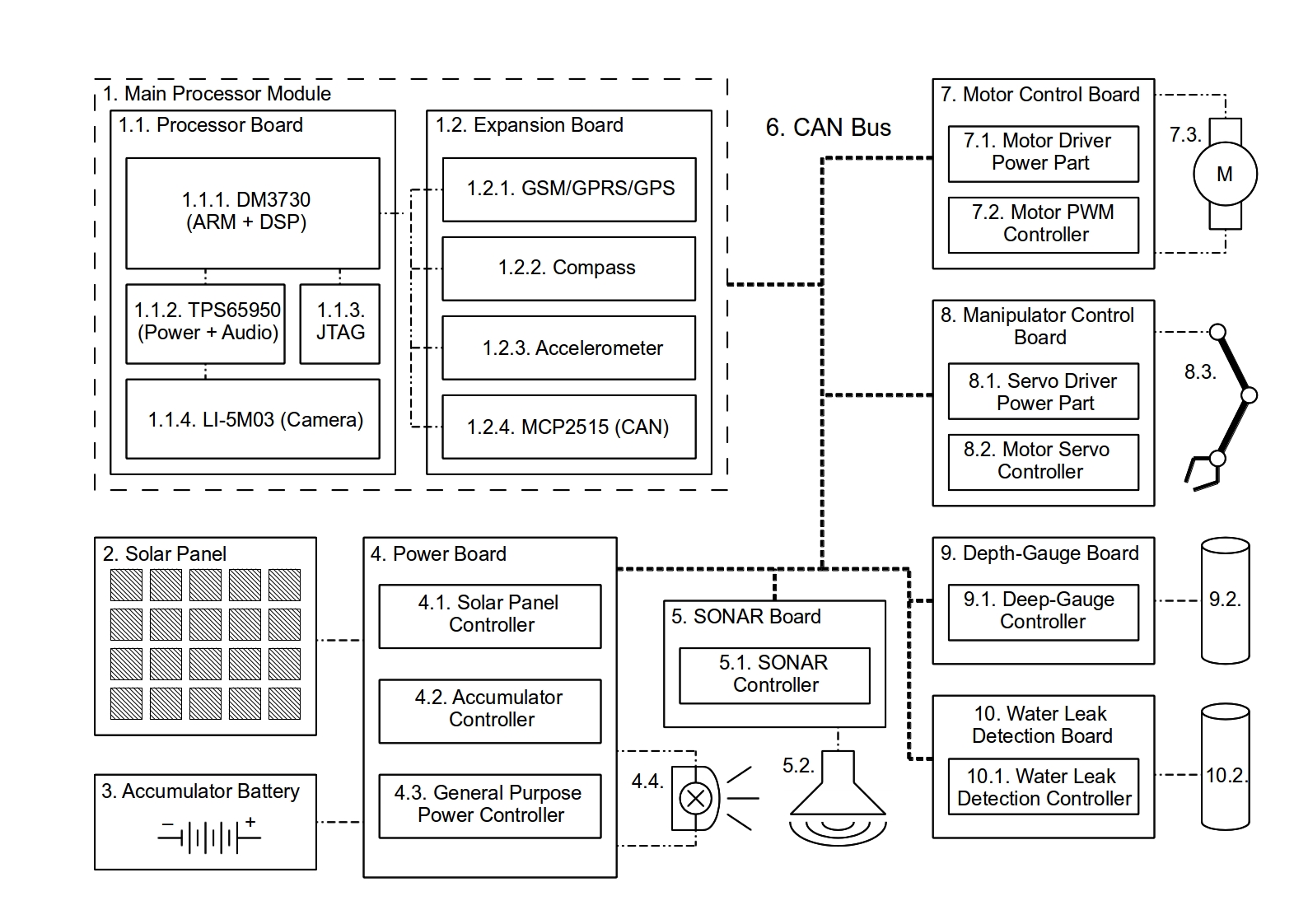 Веду похожий хобби-проект, только AUV. Начал с программной части (Linux на OMAP3, работа с изображением и распознавание образов в OpenCV + ускорение на DSP), потом займусь электроникой, затем корпус, механика и т.д. Краткая hardware architecture во вложении.