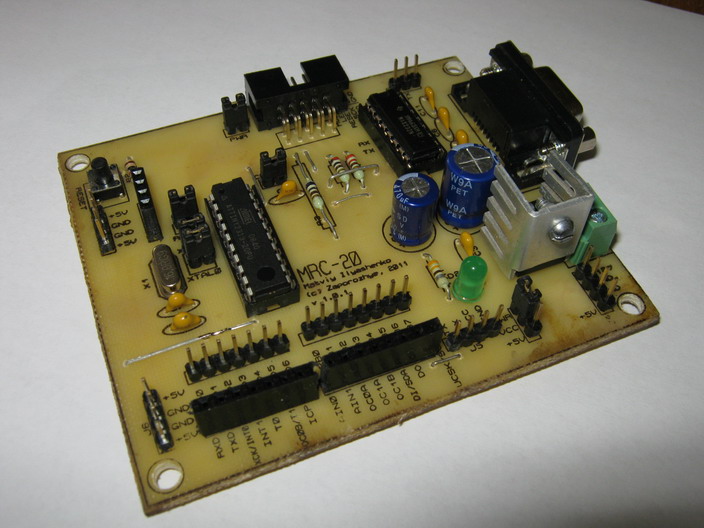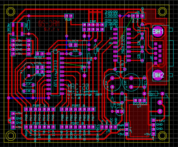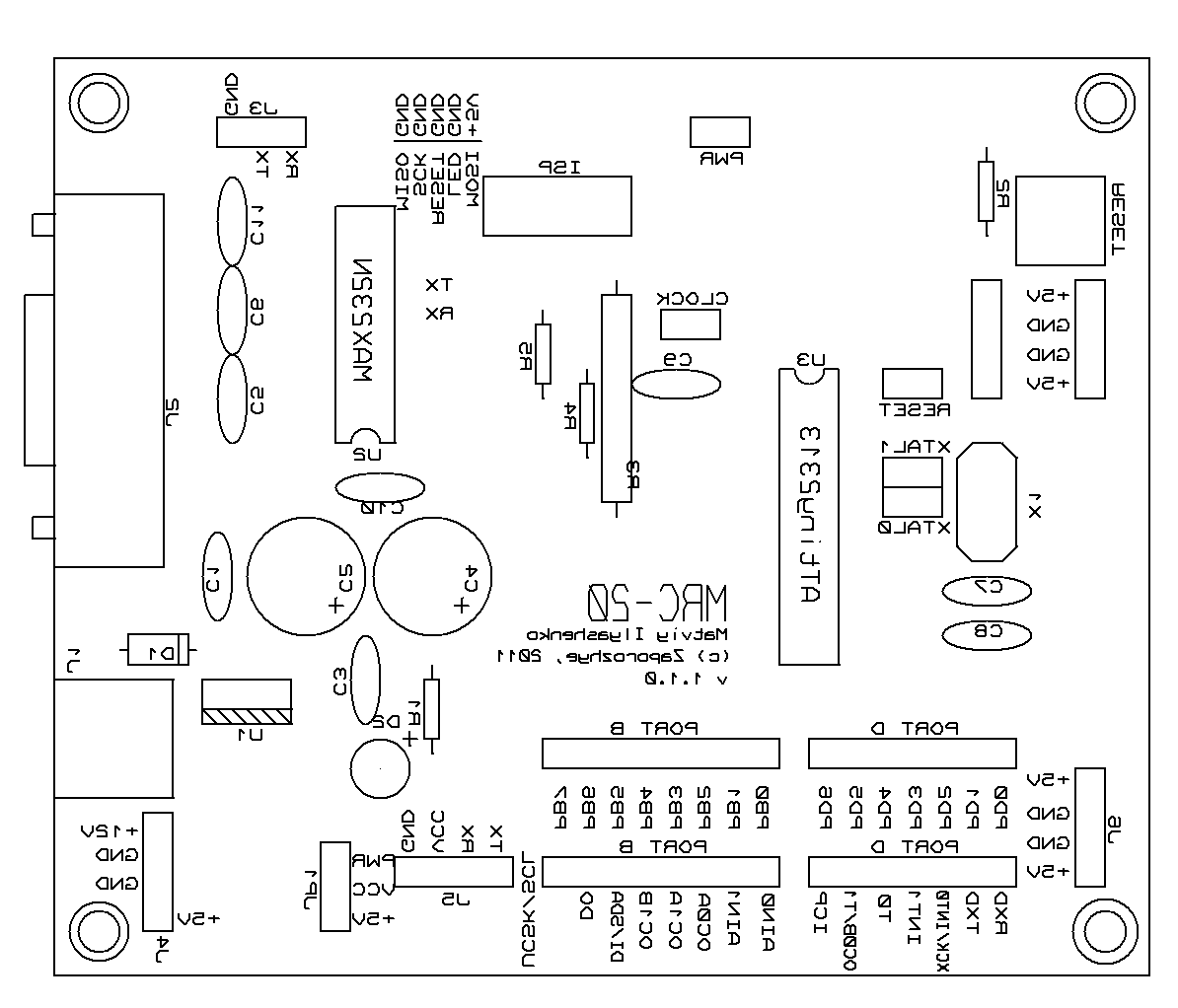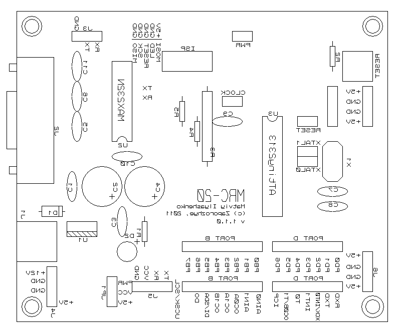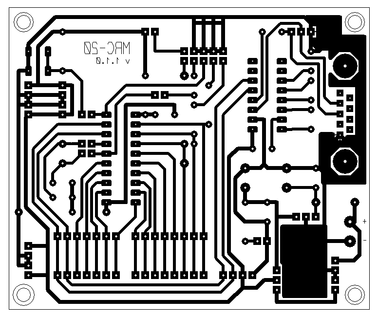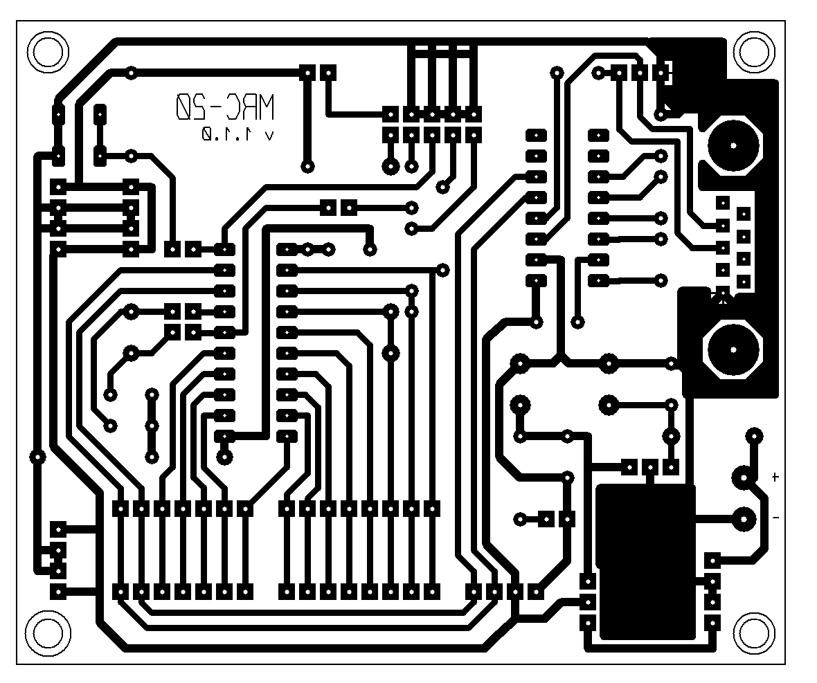 Плата выполнена в одностороннем варианте, размерами 80х95 мм (чуть больше чем MRC-28 за счет более широких дорожек и большего расстояния между дорожками, для удобства ее изготовления методом ЛУТ). На плате присутствует стабилизированный источника питания 5 вольт, собранный на линейном стабилизаторе L7805 (который без переделки платы можно заменить на любой Low-Drop, в этом случае на плате предусмотрено достаточно места, чтобы его можно было прикрутить болтиком к плате так, чтобы тепло рассеивалось медной площадкой на обратной стороне, по аналогии с тем, как это сделано в MRC-28 и MRC-40) и интерфейс Com-порта на MAX232N.