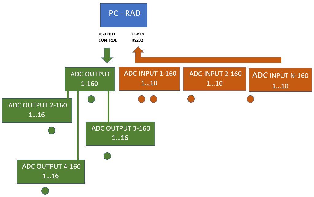 IN - так PC (RAD)> UART USB(COM2...256)>ADC>10 каналов на каждый ADC 0.001 - 3.000V.
