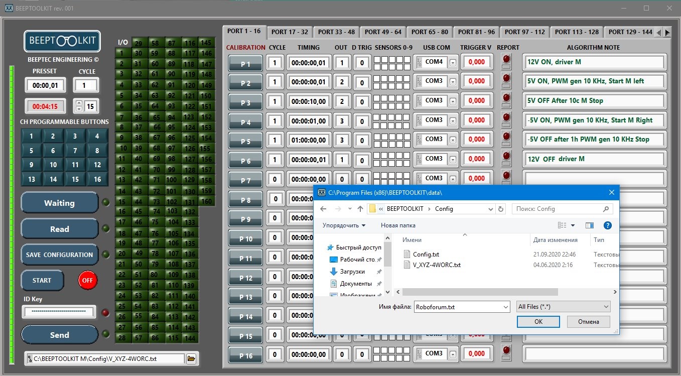 В финале алгоритмизации после проведения верификации каждой процедуры (программная симуляция или с аппаратным подключением) весь код сценария с настройками USB коммуникаций сохраняем в бинарный файл. В дальнейшем мы можем формировать библиотеки из таких конфигураций, обращаться к ним, выполнять изменения c сохранением под новым именем.