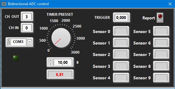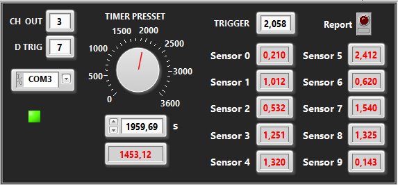 Имеем 10 резистивных датчиков (0-9) которые по сценарию в алгоритме в заданный период выполнения основного цикла запускаются на одновременный опрос в своем бесконечном цикле (скорость опроса 0,2с в цикле, скорость передачи 115200 bod). При этом условием на событие к прерыванию считывания "=" или ">" триггерного значения (в нашем случае 2,058V), которое мы указали. Так же мы по усмотрению можем указать время опроса датчиков, в течении которого должно фиксироваться заданное условие (в нашем случае это 1959,69с). В случае, если в заданный промежуток времени это условие не наступает, происходит остановка цикла на опрос датчиков и переход в общий цикл всего сценария (в нашем случае открытие логической "1" на 3 канале). При этом если в заданный промежуток времени все же происходит событие = или > Триггерного значения (константа 2,058V), передается команда к открытию одного из указанных каналов OUT (в нашем случае канал 7 с логической "1" ).