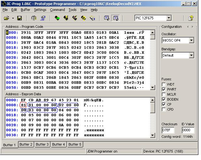 Надо загрузить прошивку в iCprog1.05, в окне eeprom появится информация предназначенная для записи в eeprom pic. Вот там и надо менять.
