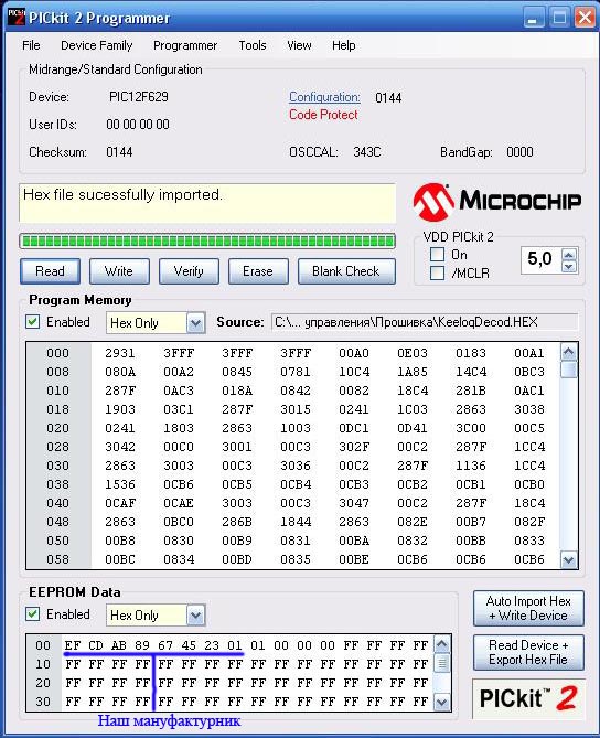 Ann писал(а):Пробовал прошивать брелок с помощью PicKit-2, шьётся, но не работает , как правильно вписать мануфактурник в оболочке программатора?