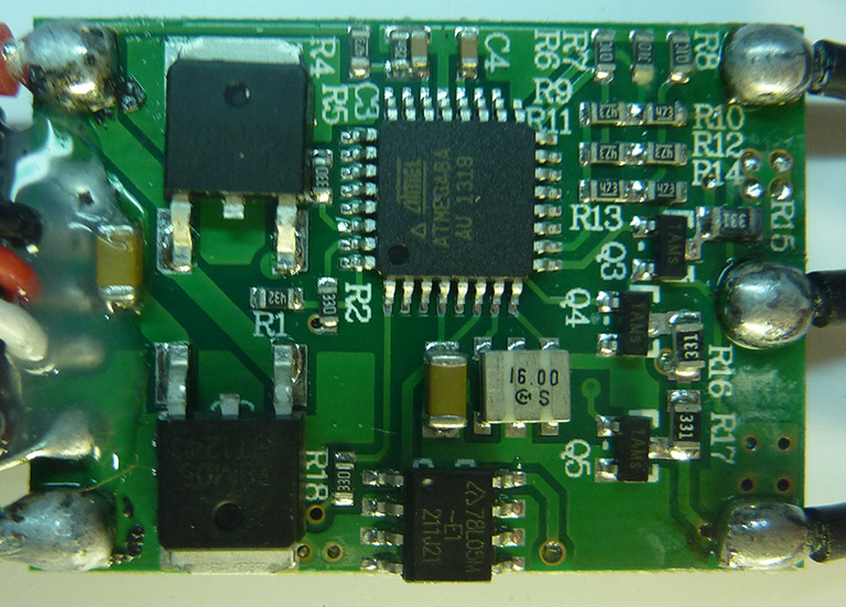 78l05m, 2 * 78m05, atmega8a, 6 * tpc8107, 6 * irf7832. пайка так себе, а так вроде вполне нормуль. я правда не понял в чём великий смысл в них стабы ставить (мелкий на мегу то понятно).