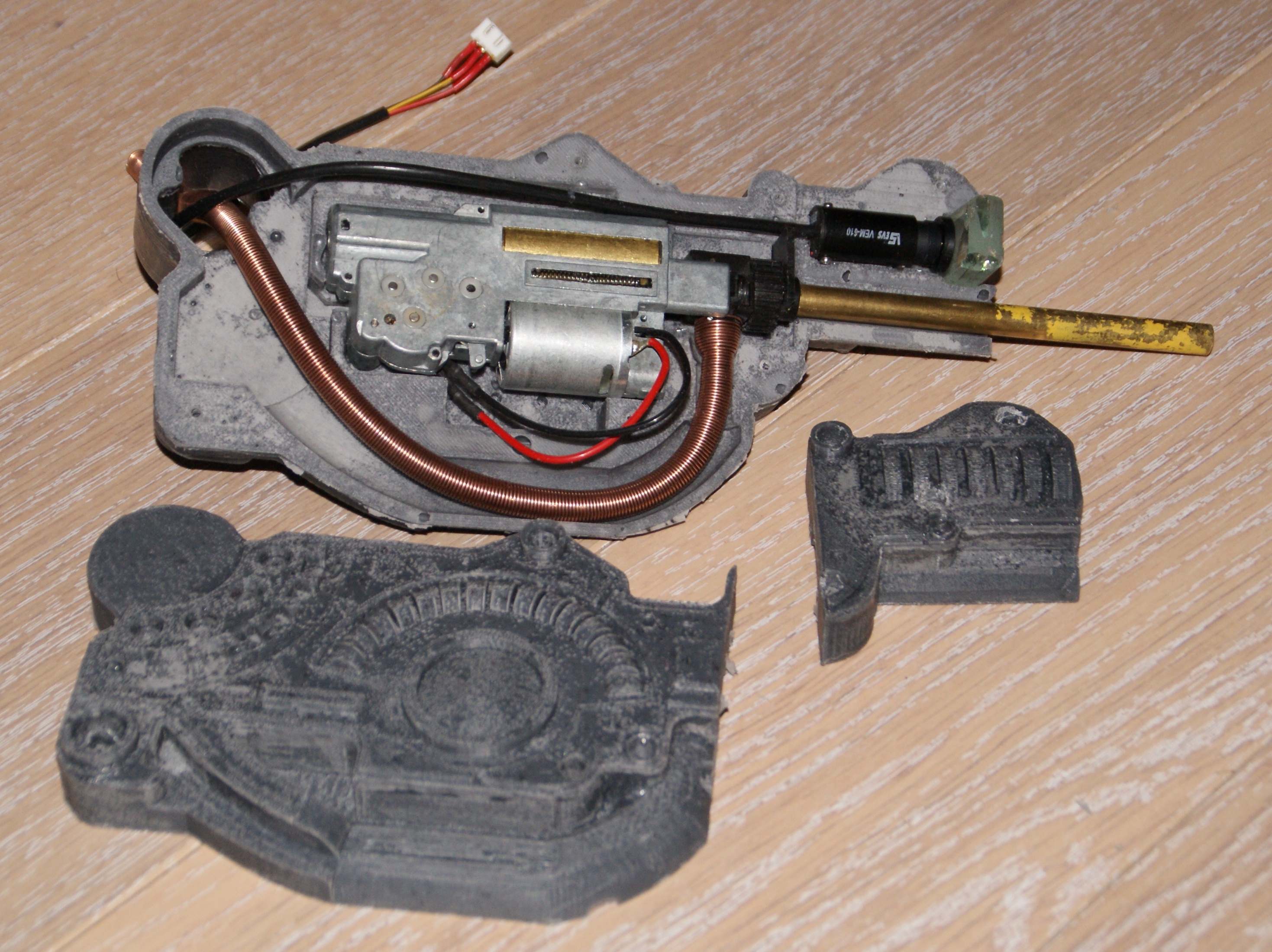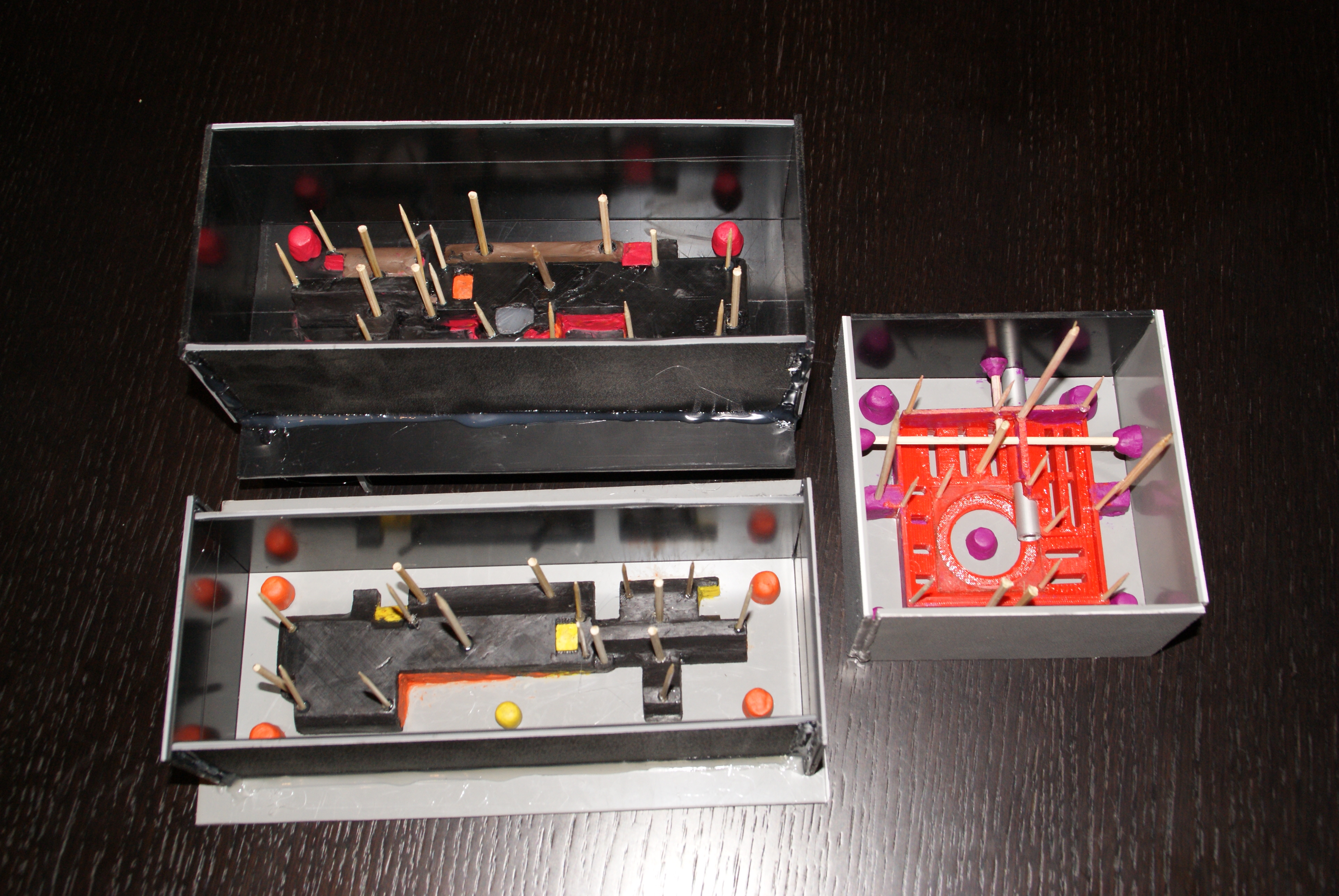 Для мелкосерийного производства провели испытания по литью пластика в силиконовые формы. Мастер модели, распечатанные на 3D принтере, были размещены на ровной поверхности. Пластилином закрыты полости, чтоб убрать протекание силикона в них. Бамбуковые палочки с диаметром 4 мм вставлены в отверстия для винтов. Зубочистки, раскушенные пополам, при помощи термоклея приклеены на всех высоких точках модели, для создания каналов для выхода воздуха во время заливки пластика. Пластиком при помощи термоклея, закреплены стенки вокруг моделей.