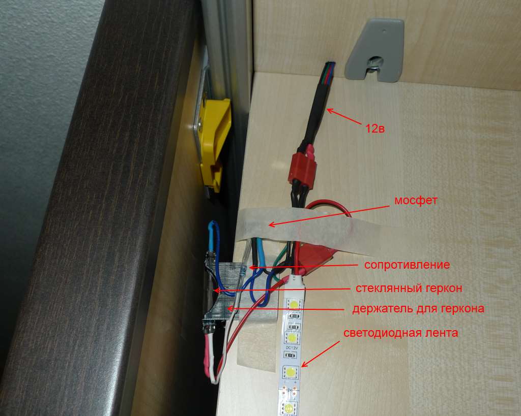 Держатель для геркона я напечатал на 3д принтере. Лента приклеена на клеевой слой. Провода и прочее приклеено временно скотчем. Благодаря разъемам всю схему можно отсоединить, подключить ленту к 12В напрямую и использовать внешний включатель. Магнит приклеен к дальней стороне двери. В закрытом состоянии магнит находится возле геркона, на gate подается минус и мосфет закрыт. Как только магнит отходит от геркона, так мосфет открывается.