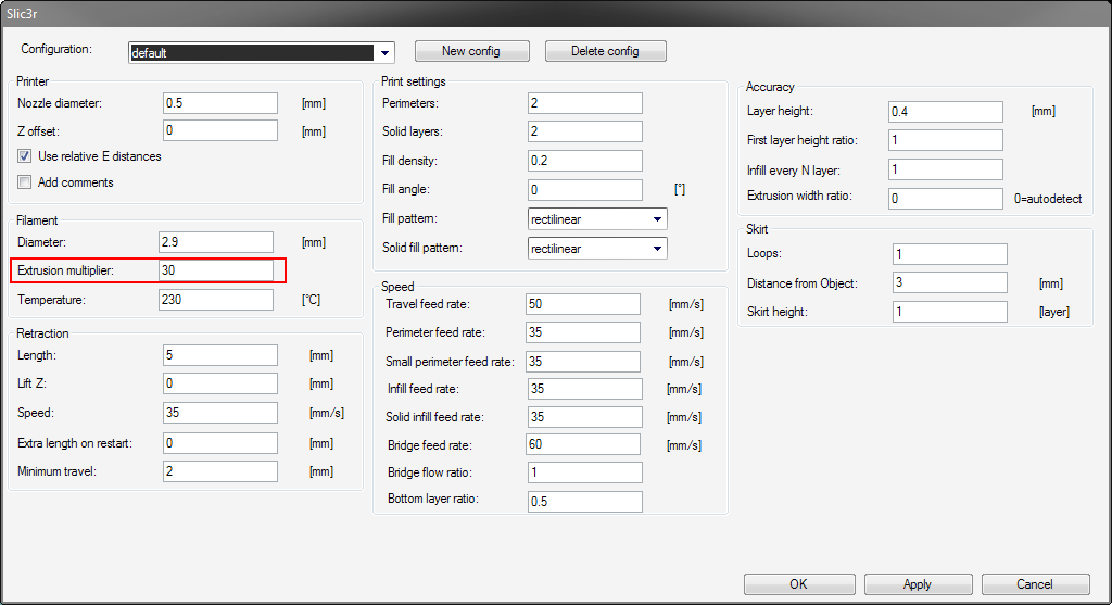 Extrusion multiplier . При изменении этого значения изменяется предыдущее введенное значение Diameter. Некоторые пользователи используют этот параметр для компенсации жесткости сырьевого прутка в большую или меньшую сторону. На самом деле калибровка экструдера, описанная в Части 1 и ввод точного значения Diameter вполне достаточные действия для нормальной работы. Оставляем по умолчанию 1.