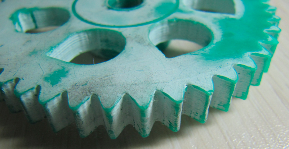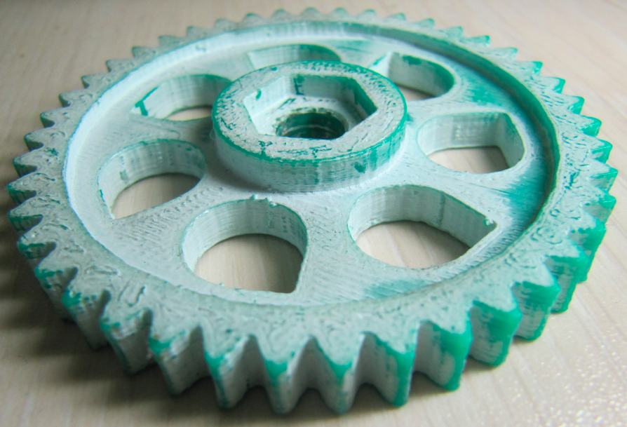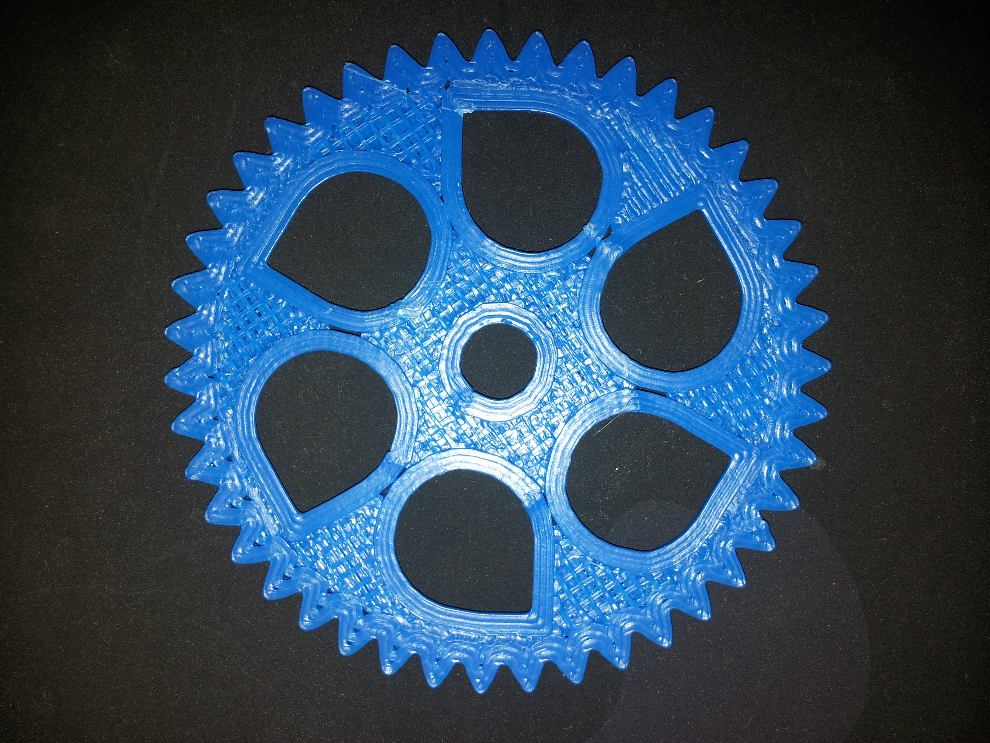 Вот результат. Напечатанная на 15% большая шестерня, Slic3r 0.8.3 (настройки по умолчанию, кроме высоты слоя 0.25мм и вкл. интерпретации дуг).