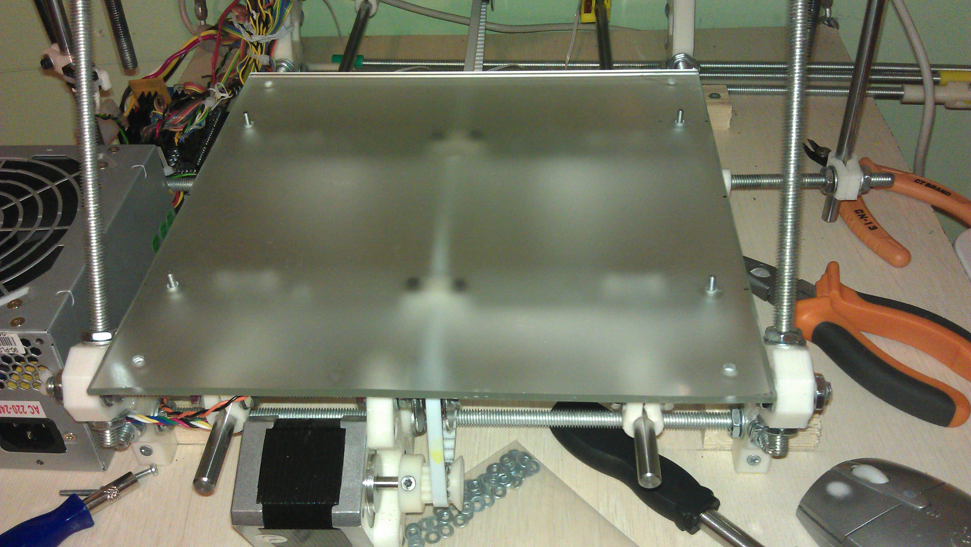 5. стол подогреваемый: убраны пружины, сделан бутерброд такой: поверх пластины крепления ремня и линейных подшипников через стойки 5 мм жестко закреплена промежуточная пластина (фанера) покрыта фольгированым скотчем для защиты от нагрева. Поверх промежуточной пластины на болтиках регулируемого подъёма жестко закреплена нагреваемая пластина.