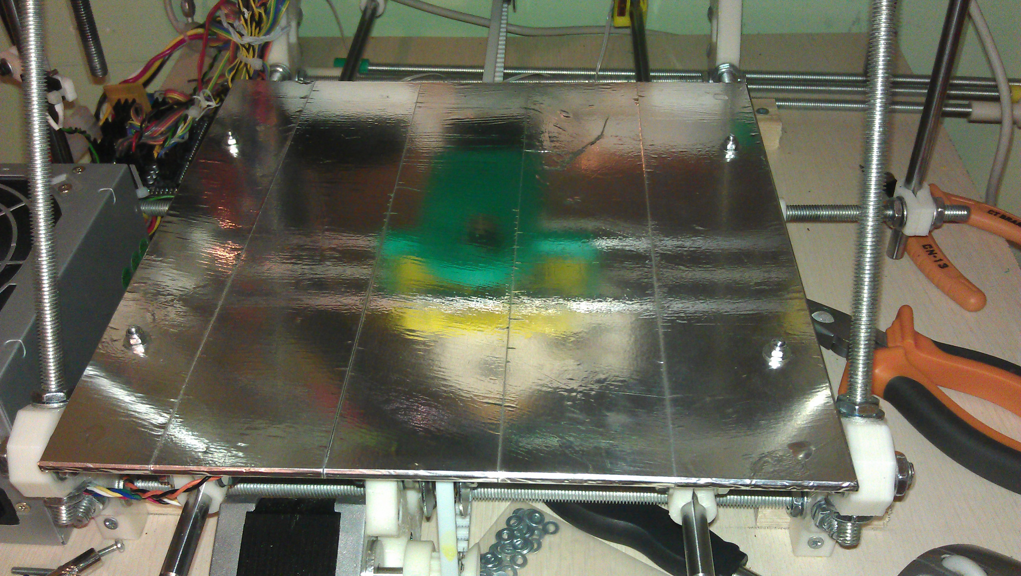 Поверх нагреваемой пластины лежит зеркало (просто находка - в ИКЕА комплект 4x 5mm зеркал 20x20см стоит ~250 руб) поверх зеркала термоскотч. зеркало крепится канцелярскими клипсами металлическими.